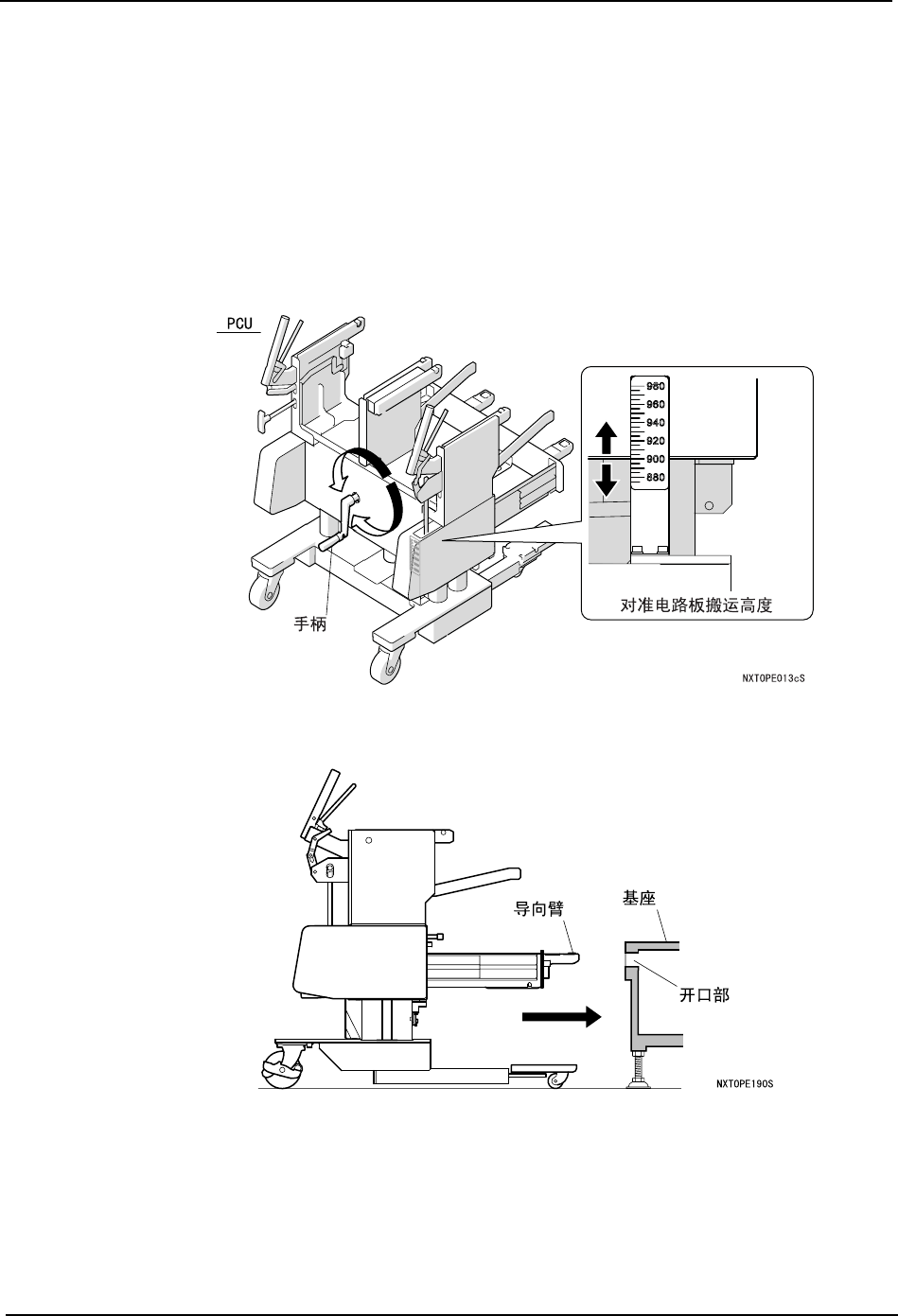 2. 准备 PCU。旋转手柄使 PCU 上下移动,请确认刻度使之对准机器的电路板搬运高度。