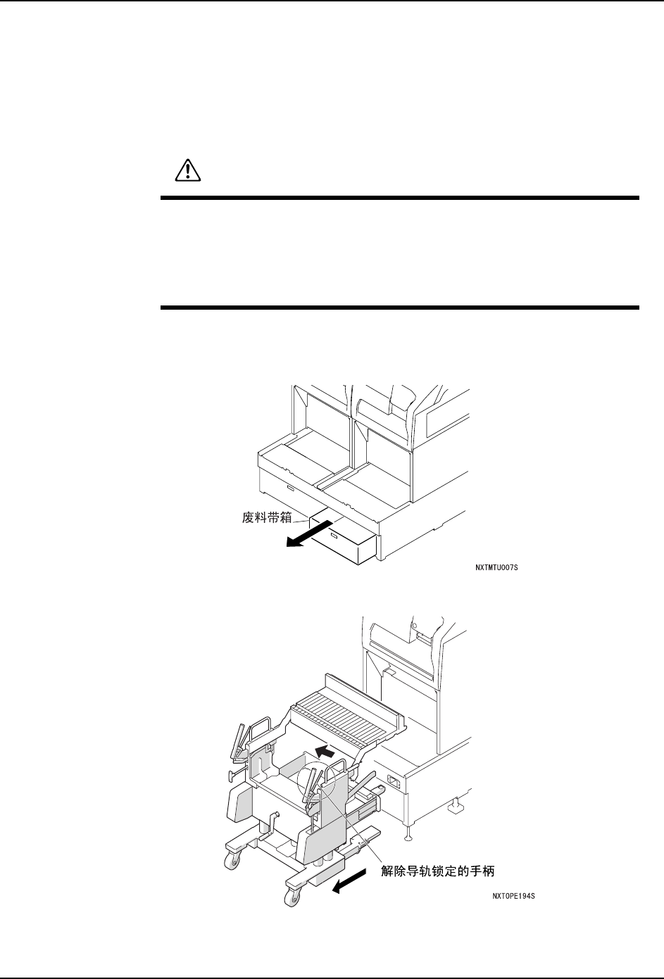 5. 基本操作 QD029-09 104 NXT 机械手册 5.6 料盘单元 -L 的安装 这个操作使用 PCU( 托架更换台车 )。 将料盘单元 -L 安装到模组上使用时, 如果有料带元件的 相关机器 ( 废料带箱, 不良元件盒, 废料带处理单元箱等 ) 时有必要卸下。 5.6.1 安装准备 1. 卸下废料带箱。 2. 请拆除供料托架,详细的拆除方法请参 考 「5.4 供料托架的拆除 / 安装」 。 注意 在内部搭载料盘的状态下, 请…