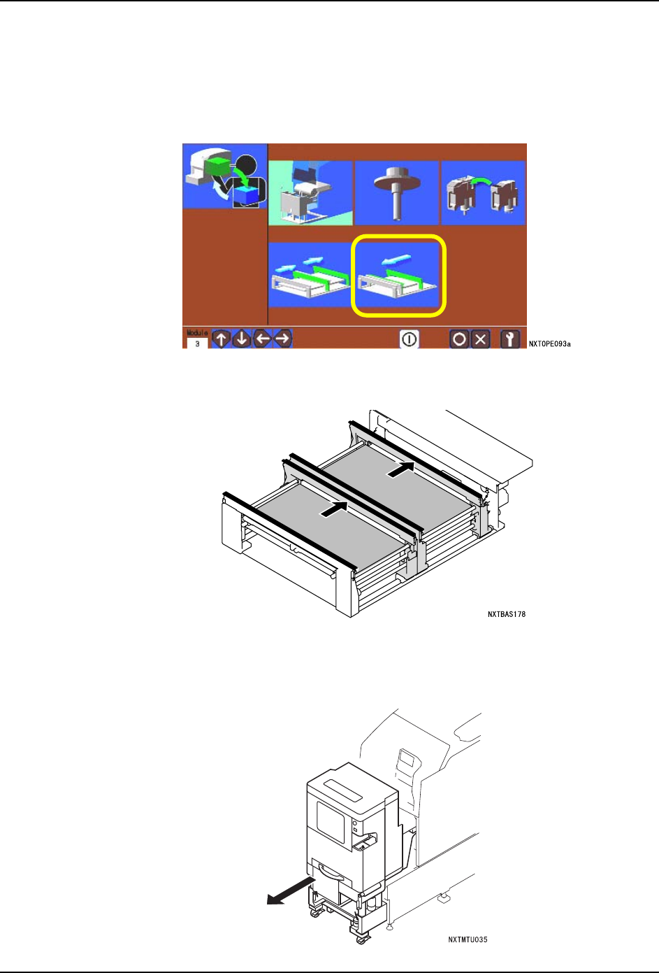 5. 基本操作 QD029-09 138 NXT 机械手册 连同通道一起更换 ( 将通道 2 稍微向前移动一些后更换 ) 1. 按下操作面板的 MANUAL 按钮,显示出手动指令。 2. 使用箭头键,选择更换单元示意图,按 下 OK 按键。 3. 请将备份板向前移动一些后选择更换指 令。 4. 请按下 STA RT 按键。将搬运轨道扩大到最大宽度,将贴装头移动到模组的 后方。移动贴 装头后,在操作面板上显示出拆 下料盘单元 -L 的向导…