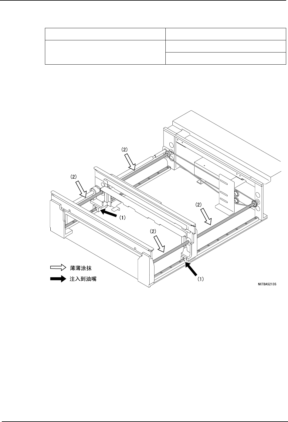 6. 预防保养 QD029-09 218 NXT 机械手册 6.9.7 双搬运轨道的加油 1. 拉出模组。 2. 使用润滑油枪,适量地给 LM 导轨的油嘴加油。 3. 请薄薄地在变更宽度的滚珠丝杆、链上 涂抹指定的润滑油。 润滑油 加油处 Daphne Eponex No. 2 (出光) (1)LM 导轨 (2)滚珠丝杆