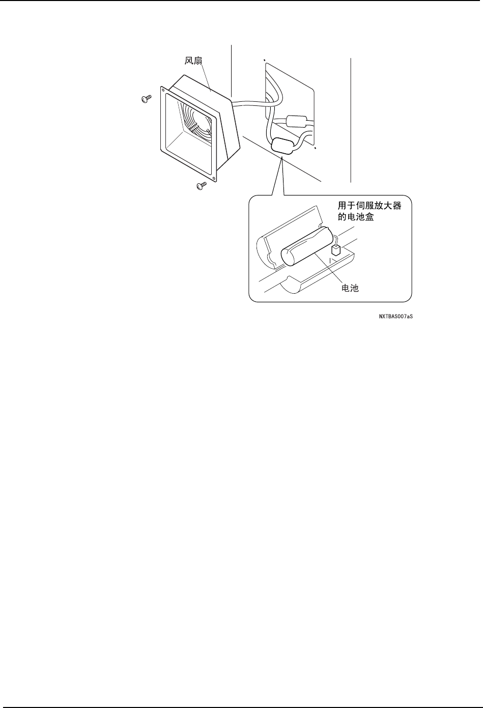 QD029-09 7. 消耗品的更换 NXT 机械手册 251 5. 请打开电池盒,将电池与新品更换。 6. 将冷却风扇安装到反面盖板上。 7. 将反面盖板安装到模组上。