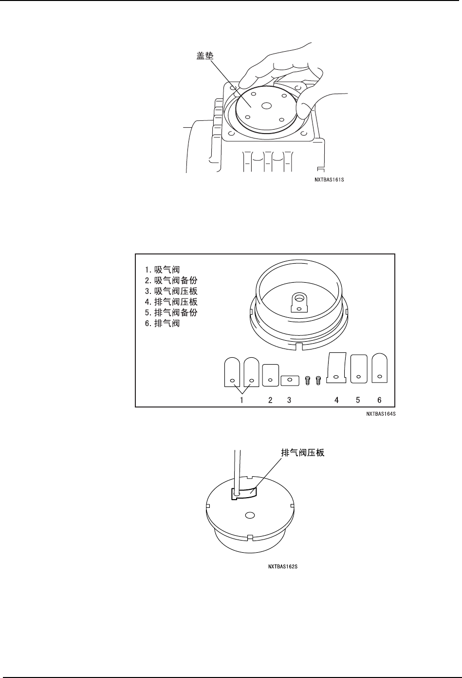 QD029-09 7. 消耗品的更换 NXT 机械手册 303 d. 拆下盖垫。 e. 从压板上取下吸气阀干扰橡胶。 f. 用含有工业用酒精的回丝擦拭压板油 脂,进行清扫。 6. 从汽缸中取出其他零件。 a. 松开固定排气阀压板的平头螺丝 (M3 × L5) 。 b. 拆除排气阀压板、排气阀备份、排气 阀。