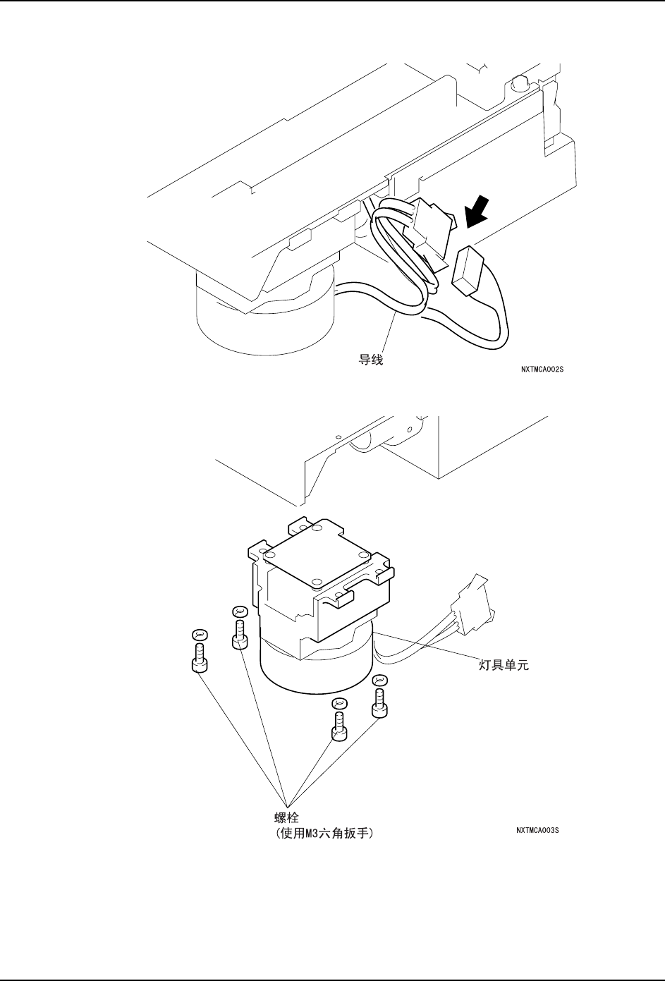 8. 部件的更换 QD029-09 314 NXT 机械手册 5. 拆下灯具单元的连接线插座。 6. 拧松螺栓 (4 根 ),拆下灯具单元。
