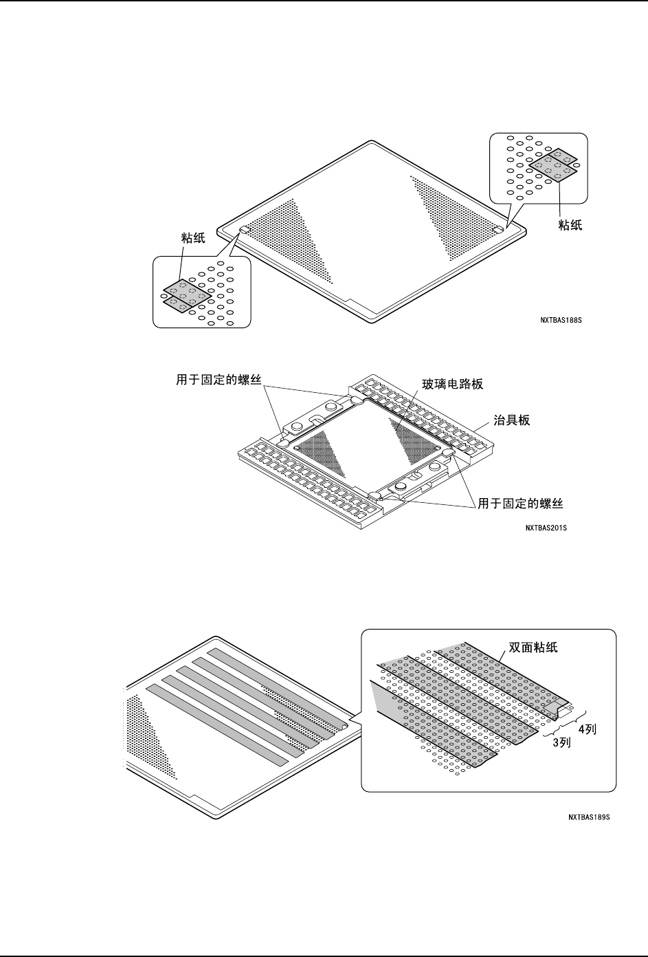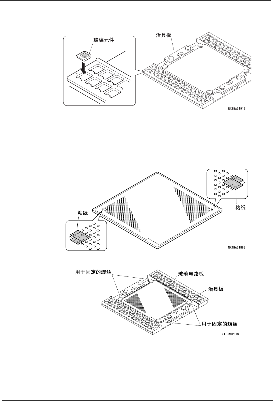 QD029-09 9. 测定和调整 NXT 机械手册 389 4. 请将玻璃元件安装到治具板上。 在 H01 贴装头上, 己方的 1 列上安装 16 个。 在 H04 贴装 头上安装 64 个。 备注 ) 玻璃电路板的表面,请经常保持清洁的状态。 H08,H12 测定时 1. 请将与右上,左下的角落的定位点相邻的 2 列的定位 点用粘纸覆盖住。这是为了防止错 误读取在角落的定位点。覆盖的粘 纸请贴在玻璃电路板的定位点印刷 面。 2. 请…