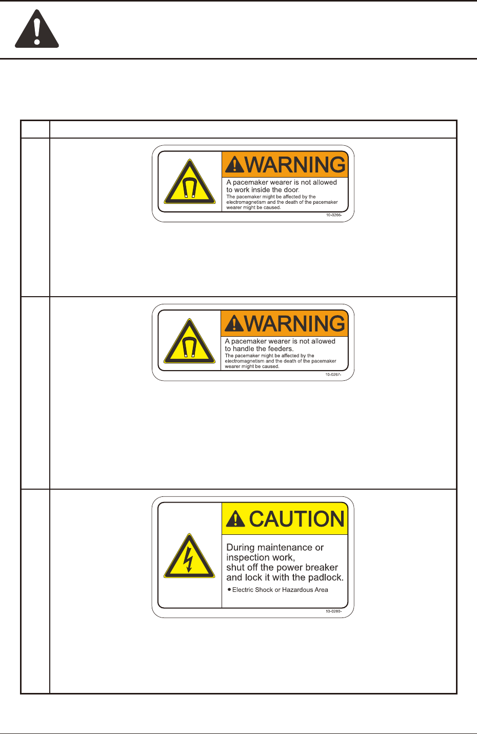 Safety Precautions Safe-29 1OM-1840 1604-001 5. Alert Labels Alert Labels and Description No. Alert Labels and Description (1) Description Strong permanent magnets are used in the moving mechanisms of the X/Y beam. Tho…