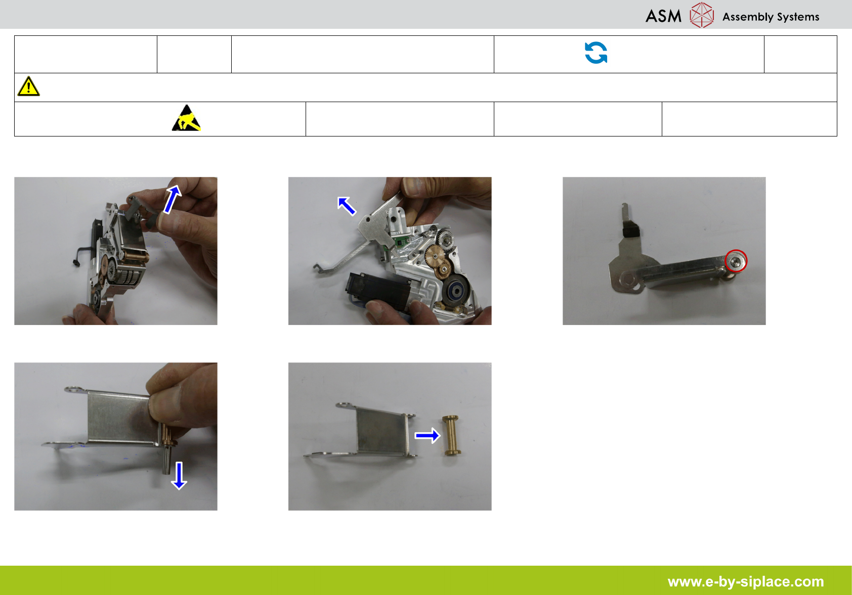 E-by SIPLACE Smart Feeder 44 mm E Removing the Roller Axle Part Exchange 6/12 CAUTION! Refer to safety inst ructions in user manual before working on the machine. ESD guidelines are to be followed Tool: T6 Wear Part: C o…