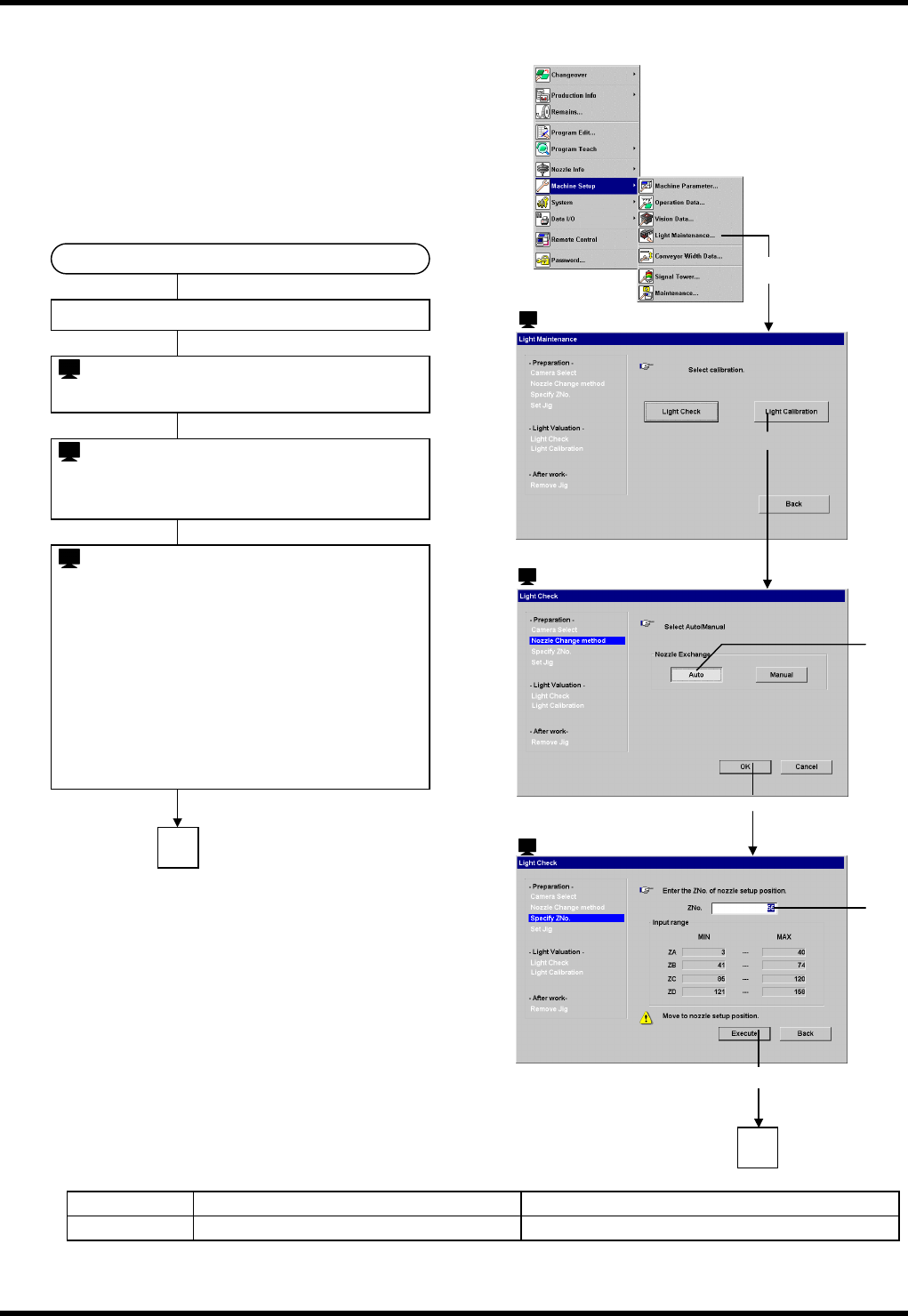 BM123 参考手册 5.5 照度 维护 E36RCC-60- 410-A0 5.5-8 照度的校准方法 ( 自动 ) 为了通过吸嘴交换的指 定选择自动模式,在 选择了正在 使用规定吸嘴的品种程 序的设备内有必要设 定使用的吸 嘴。 = 提示 = 可用于照度诊断的吸嘴 为 L 吸嘴、 MG- P 吸嘴、 MG 吸嘴 、 M 吸嘴。 = 提示 = 1 发生位置 错误信息 处理方法 = 提示 = 1 输入数据不正确 。 请输入 ZNo.…