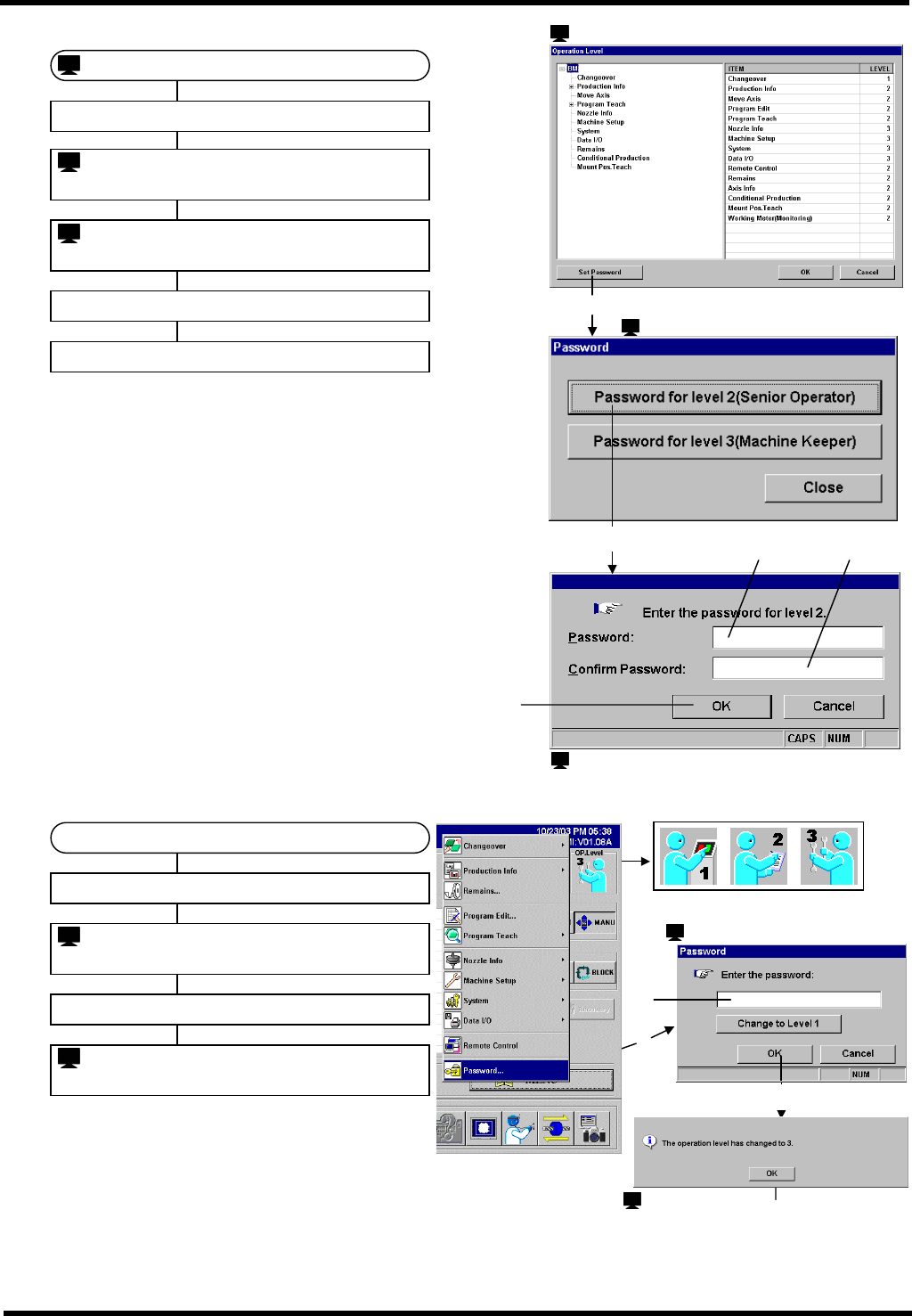 BM123 参考手册 6.2 操作 级别的设定 E36RCC-61- 030-A0 6.2-4 4. 密码的设定方法 操作级别的变更方法 <MENU > 1. < Operation Lev el Change > ( 变更操作级别 ) : ‘Opera tion Lev el Chan ge’ ( 变更操 作级别 ) 2. 输入密码 3. <OK> : ‘Conf irmation of c…