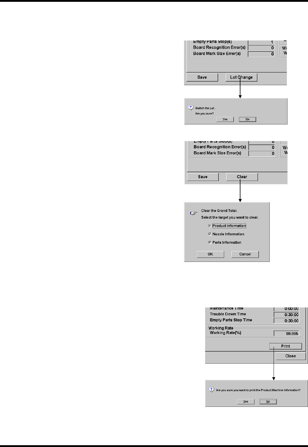 在 ‘Current Product’ (生产品种) 画面和 ‘Machine Total’ (设备累计) 画面上,选择清除对象数据的方法各不相