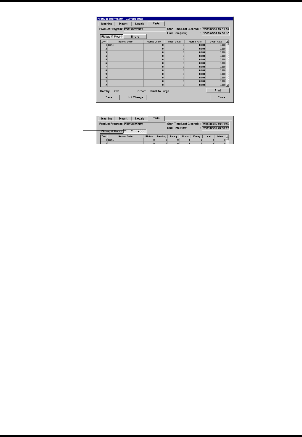 BM123 参考手册 3.3 实装 信息、吸嘴信息、 元件信息 E36RCC-24- 030-A0 3.3-2 3.3.2 吸嘴信息 1. <Pick Up Count> ( 使用次数 ) 以 ‘STNo.’ ( 站 No. ) 为单位显示下列 数据。 吸嘴 ( 吸嘴名称 ) 吸附次数 贴装次数 吸附率 贴装率 2. <Erro rs> ( 错误次数 ) 以 ‘ST № ’ ( 站 № ) 为…