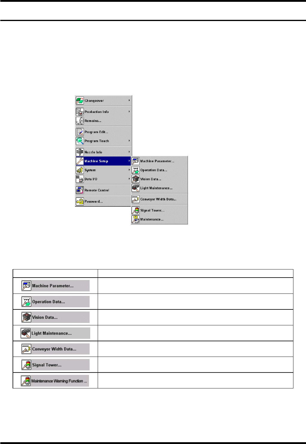 BM123 参考手册 5.1 概要 E36RCC-60- 010-A0 5.1-1 5.1. 概要 E36RCC-60-010-A0 5.1.1 概要 设备的系统在出厂前已 事先进行了调整、设 定。 请根据需要进行变更。 = 注意 = 用于系统设定的数据只 能由接受过相应教育 的人员完成,设定人 员应非常熟悉该设 定可能引起的变化。 5.1.2 机器设定的菜单 = 提示 = <M achine Setup > ( 机器设定 …