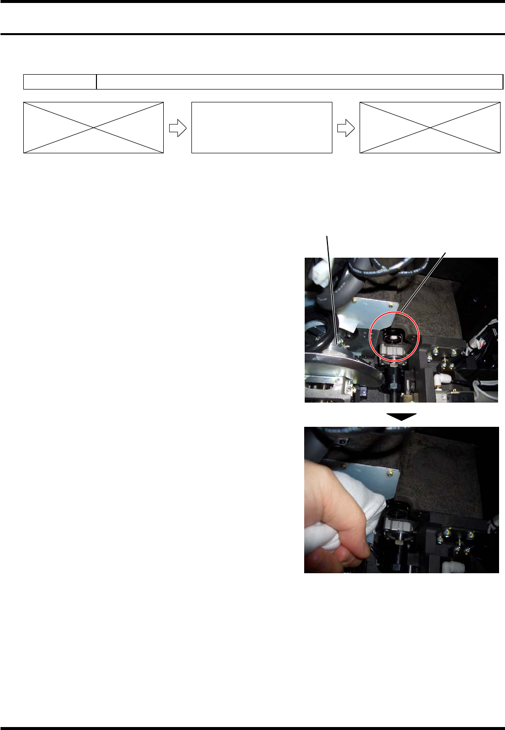 AV131 维修手册 8.5 识别、 照明 D79MCC-W 0-400-A0 8.5- 2 照明器清扫的步骤 = 准备 = 1. 清洁工具 2. 干燥、柔软的布 2. 1. 将机器返 回原点,然后 将伺服开关置于 OFF ,或关 闭电源。 2. 打开设备 前罩盖。 3. 从机器的 前面看去, 照明器位于砧 座装置的右 侧。 用准备 好的抹布 擦去照明器上部 的污垢、灰尘 。 4. 再次进行 基板孔识别动 作,确认不会 发生 “ 孔…
