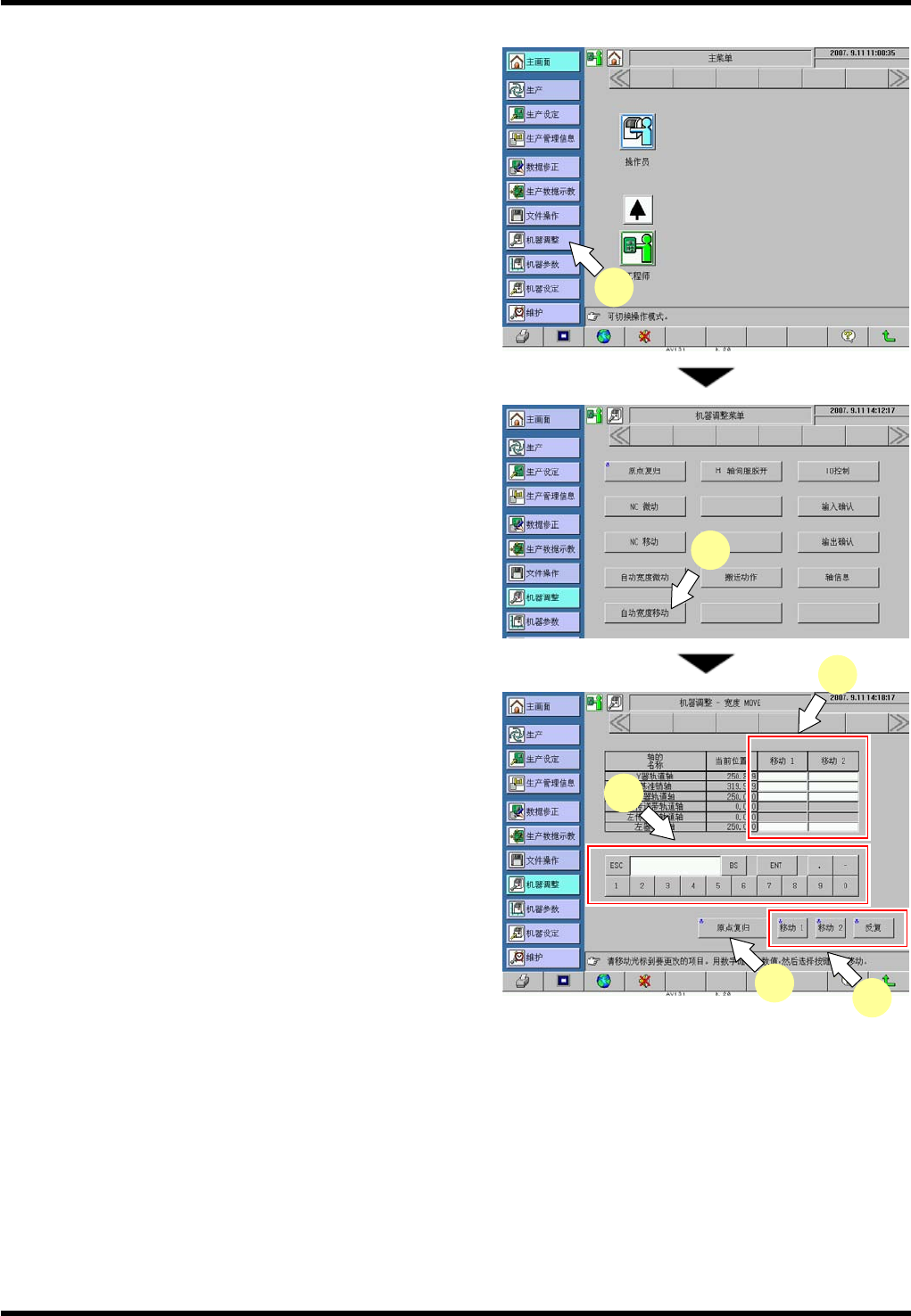 AV131 维修手册 9.1 移动检 查 D79MCC-71- 010-A0 9.1- 7 9.1. 5 宽度调整轴移动 5. 1. 按下主菜 单的 [ 机器调整 ] 。 显示 “ 机器调整 菜单 ” 画面。 2. 按下 [ 自动宽度移动 ] 。 显示 “ 机器调整 - 宽度 MOVE” 画面。 3. 按下要移 动的轴名称的 [ 移动 1] 、 [ 移动 2] 。 4. 输入移动 坐标。 5. 按下 <E NAB LIN G>…