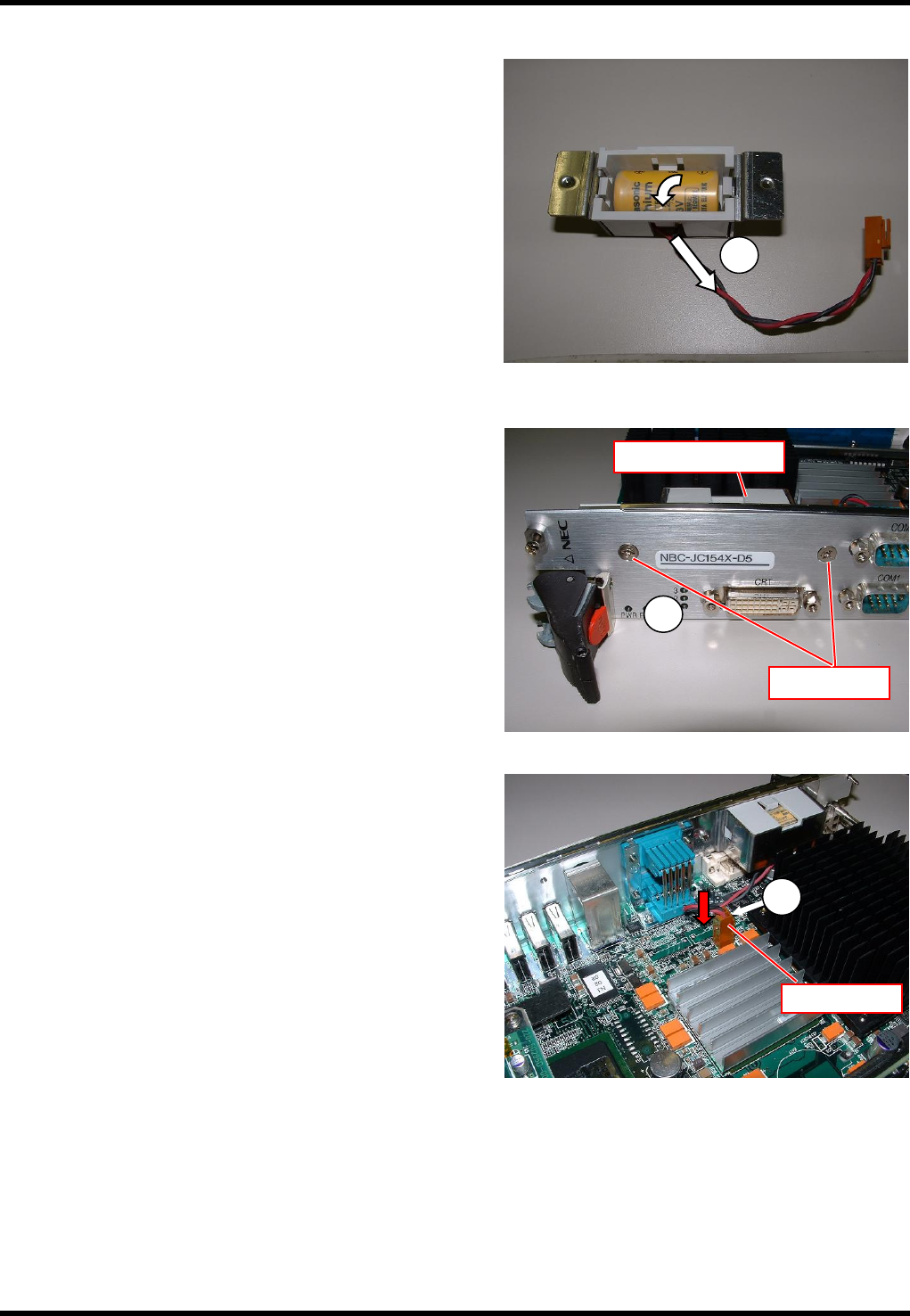 AV131 维修手册 10.3 蓄电池的 更换 D79MCC-A 1-080-A0 10.3- 5 11. 将板插入 ,然后往内侧 提起上、下两 处的杆,并固 定。 12. 用螺丝 (2 处 ) 固定 CP U 板。 13. 连接电缆 。 14. 将主电源 开关置于 ON 。 螺丝 CPU 板 电缆 螺丝 13 12 12 11 旋转