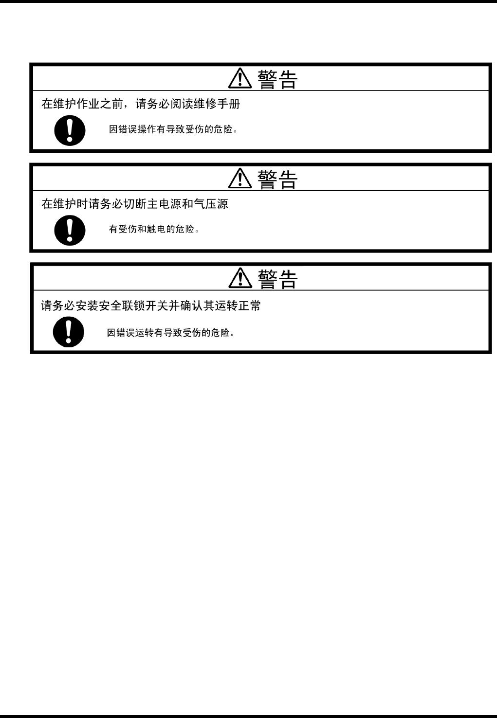 AV131 维修手册 2.1 安全注 意事项 D79MCC-10- 010-B0 2.1- 2 2.1. 2 安全作业 在进行规定的作 业时,请务必 遵照安全作业 步骤以 避免事故或损 伤。 请勿修正、忽视 、变更安全设 施及安全电路 。 正常 操作时的注意事项 请在设备上装备 的所有的安全 功能都启动的 状态下 ,再进行通常 的操作。 元件 供给、机种切换、维 修时的注意事项 与此相关的作业 请在设备上安 装的安全功能 运行时…