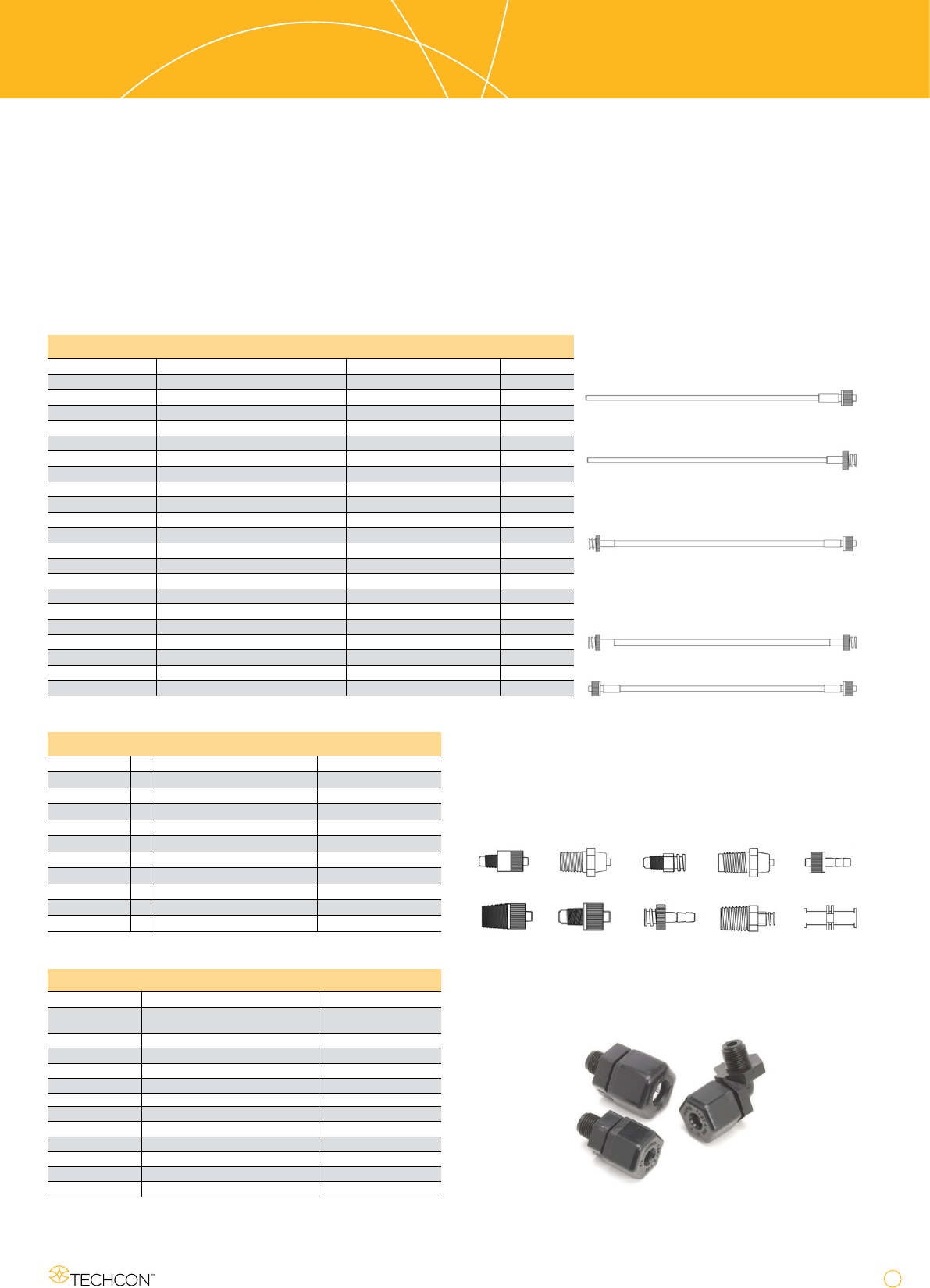 www.techcon.com 29 流体管组件 鲁尔转接头 所有 TSD931 系列接头均为模制件,对溶剂、酸和树脂液具有良好的 化学耐受性。锁定端 可 适配 TSD126 系列软管组件上使用的所有标准 的点胶针头和模制接头。如需完整列表,请与当地代表联系。 压配式接头 & 管路 压配式接头 & 管路可形成牢固的连接并增加流体流动。 点胶 附件 流体管组件 料号 尺寸 连接头 材料 TSD126-118PK 0.100…