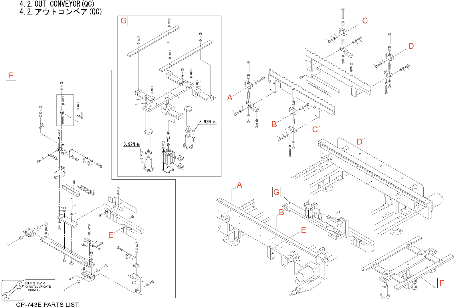 4.2.OUT CONVEYOR(QC) 4.2.アウトコンベア(QC) 番号 図番 & コード番号 個数 品名 規格 材質 備考 No. Drg.No. & Code No. QTY Description Rating Materials Remarks 1 DGQC3400 1 BKT, SENSOR BKT センサ FE 12 DGQC3420 1 PLATE, LIFTER プレート リフタ FE 13 D…