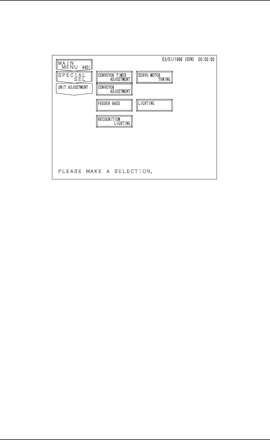 0305-001 Tg0860-PM-MM 9. UNIT ADJUSTMENT Display When the [UNIT ADJUSTMENT] key is pressed at the “SPECIAL SEL.” display , the following display appears on the screen. [CONVEYOR TIMER ADJUSTMENT] Key When this key is p…