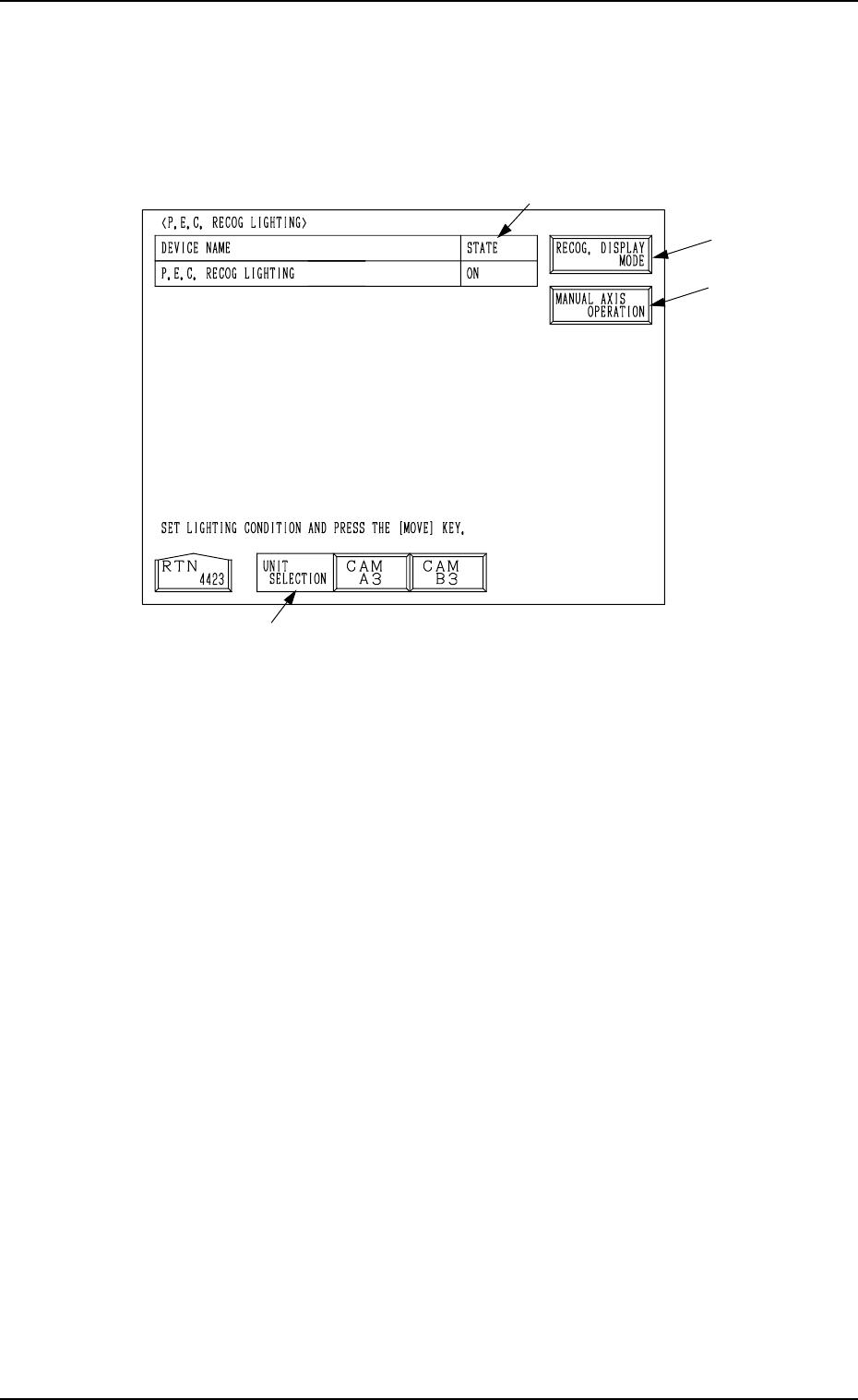 0305-001 Tg0860-PM-MM 9.4.2 P .E.C. RECOG LIGHTING Display When the [P .E.C. RECOG LIGHTING] key is pressed at the “RECOGNITION LIGHTING” display , the following display appears on the screen. When a lighting unit is sel…