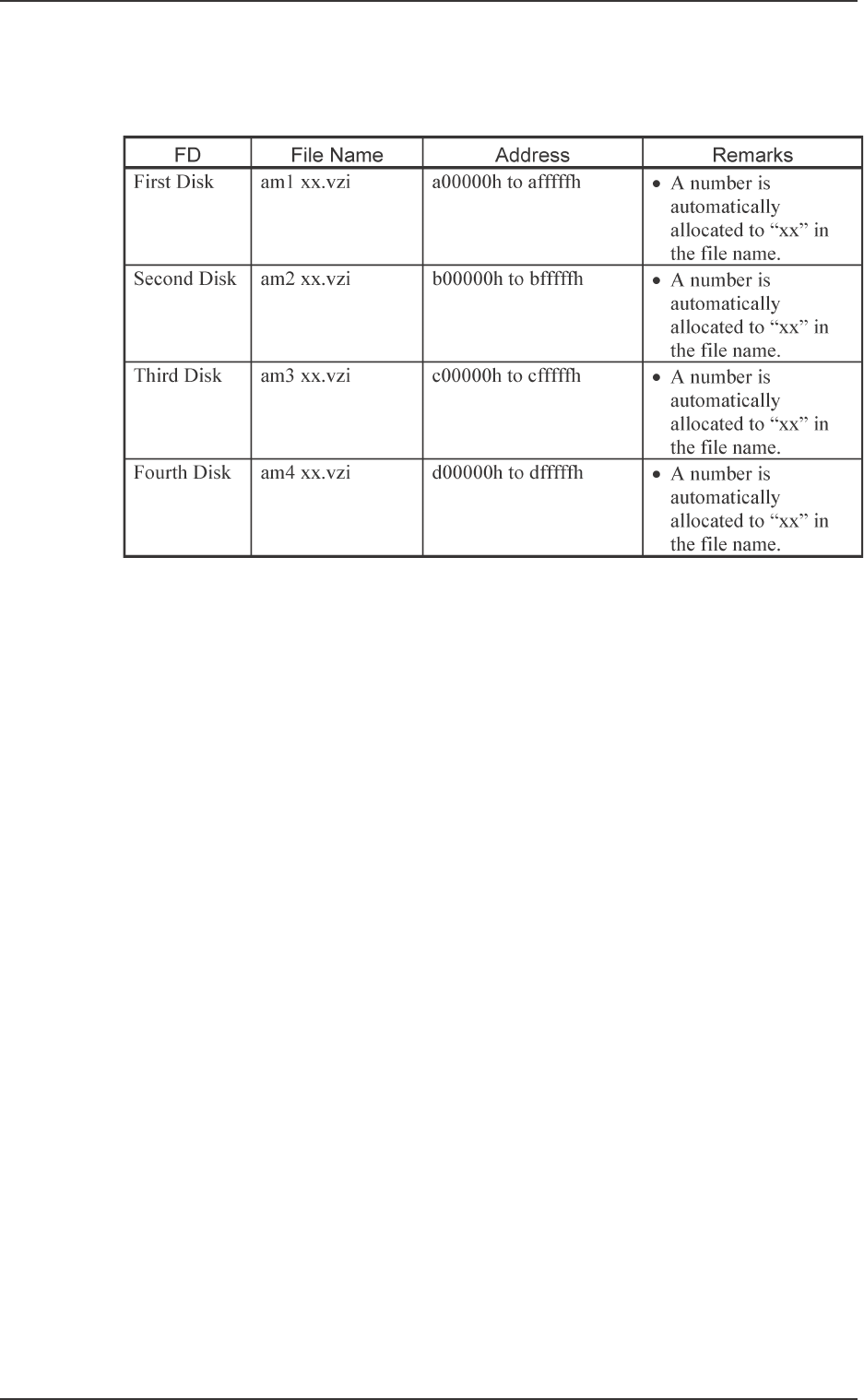 0307-002 Tg0860-PM-MM 10.1 SA VE ALL BACKUP DA T A Display 3-200 Created Files Shown below are the files and the addresses created in the four floppy disks. T able 4C18
