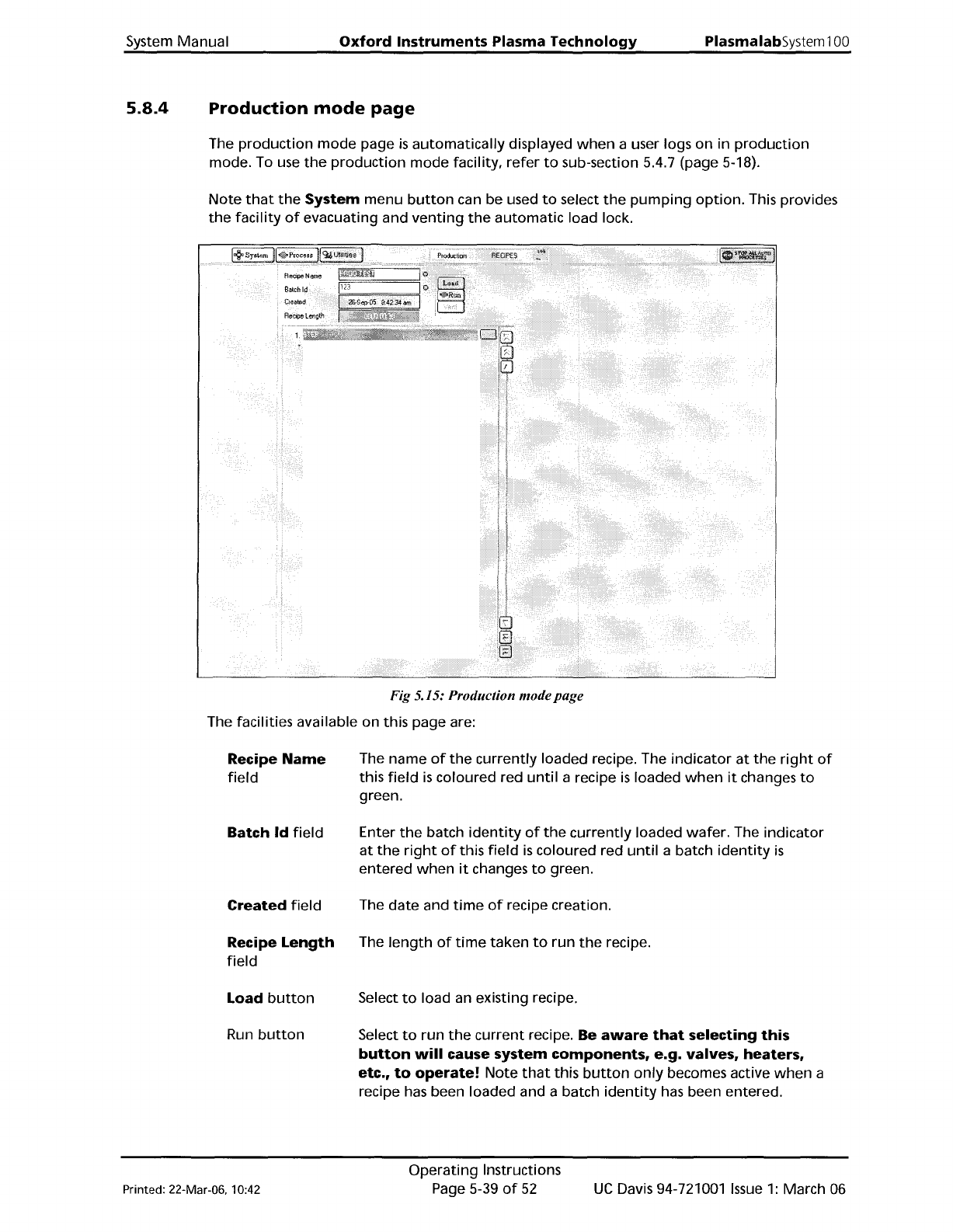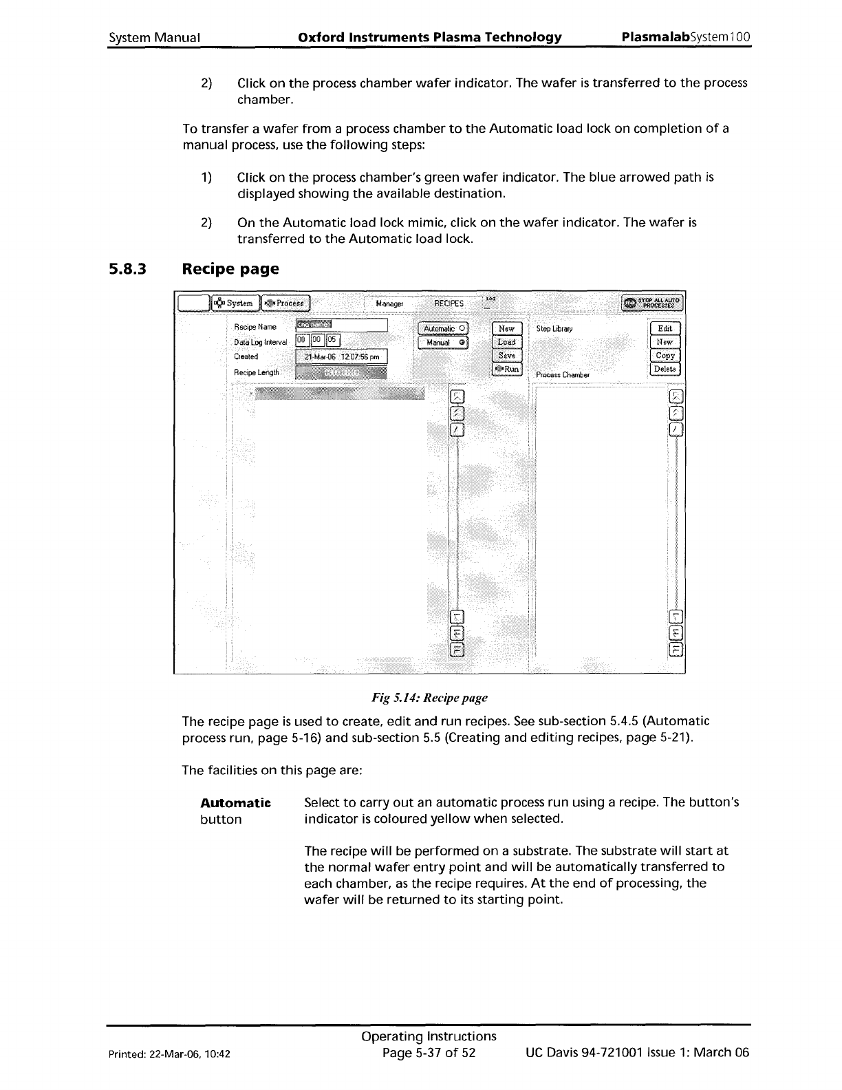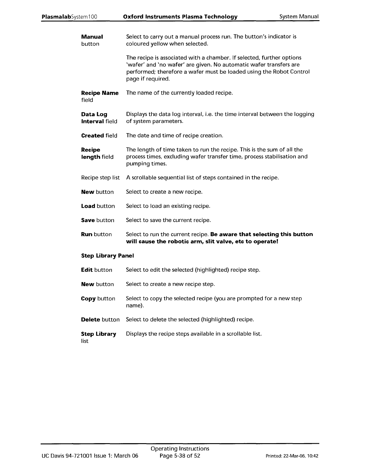 PlasmalabSystem 100 Oxford Instruments Plasma Technology System Manual Manual button Recipe Name field Data Log Interval field Created field Recipe length field Recipe step list New button Load button Save button Run but…