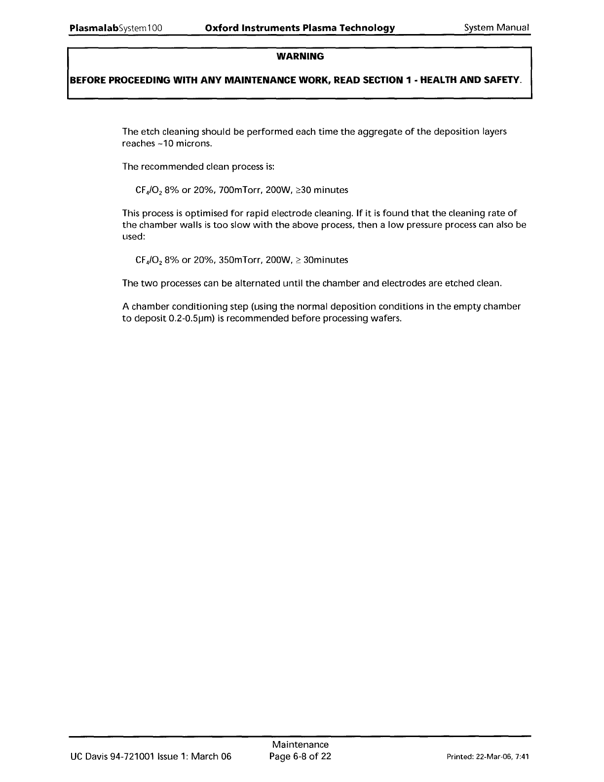 System Manual Oxford Instruments Plasma Technology WARNING PiasmaiabSystem100 BEFORE PROCEEDING WITH ANY MAINTENANCE WORK, READ SECTION 1 - HEALTH AND SAFETY. 6.4.3 6.4.4 6.4.5 6.4.6 Three-Monthly 1) Heater/chiller unit …