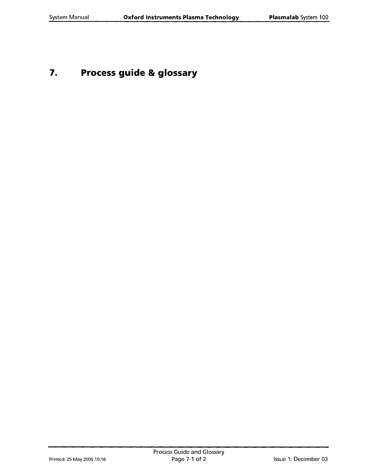 System Manual Oxford Instruments Plasma Technology Plasma lab System 100 7. Process guide & glossary Printed: 25 May 200510:16 Process Guide and Glossary Page 7-1 of 2 Issue 1: December 03