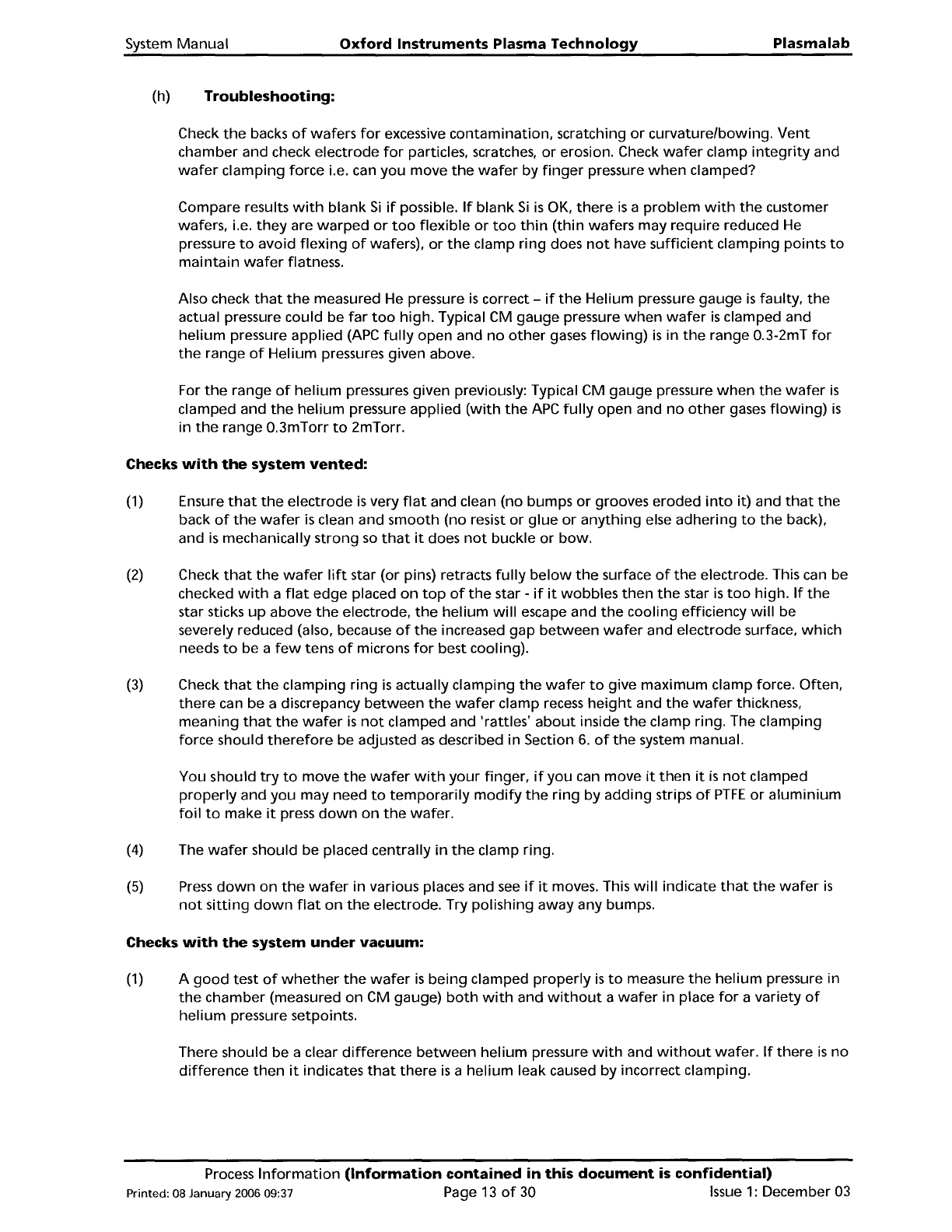 System Manual (h) Troubleshooting: Oxford Instruments Plasma Technology Plasma lab Check the backs of wafers for excessive contamination, scratching or curvature/bowing. Vent chamber and check electrode for particles, sc…