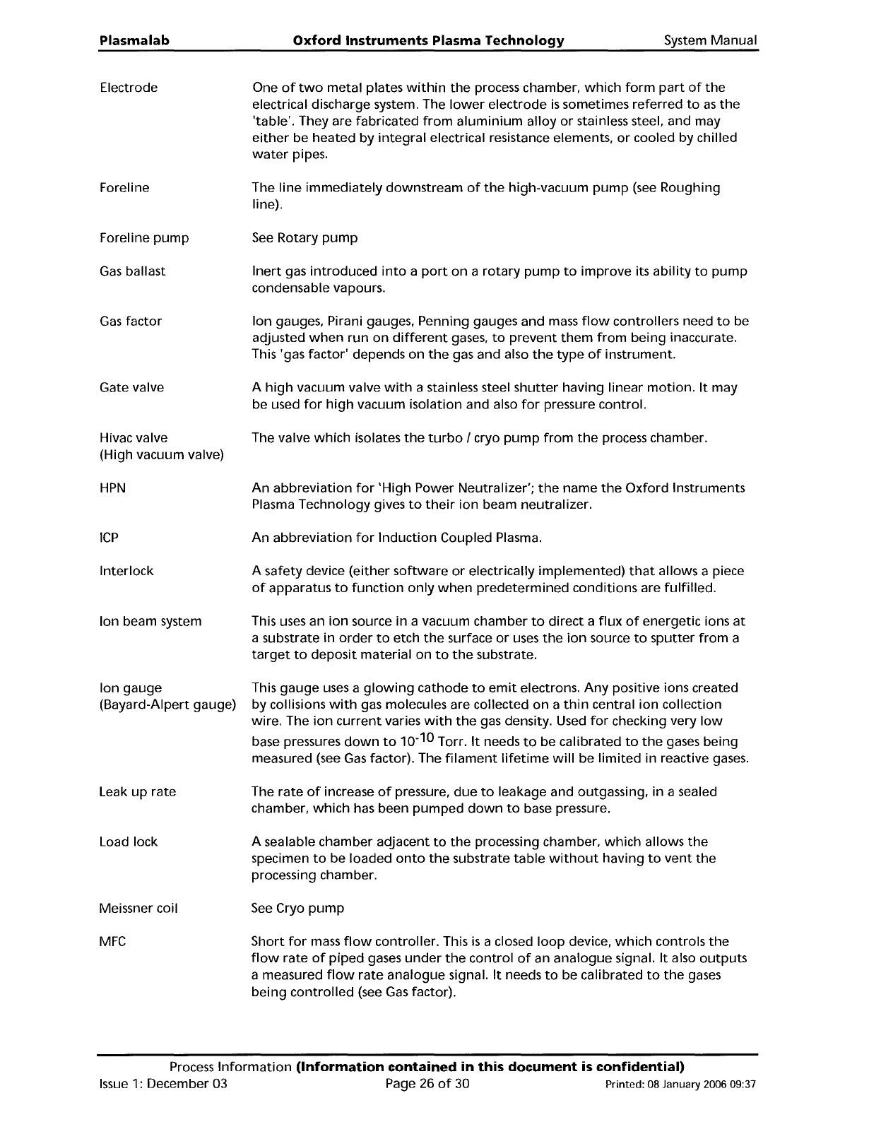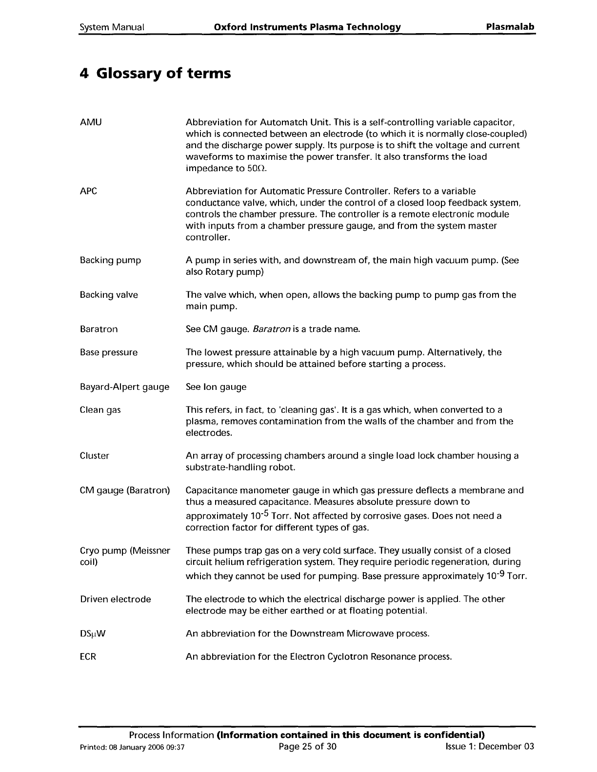 System Manual Oxford Instruments Plasma Technology Plasma lab 4 Glossary of terms AMU APC Backing pump Backing valve Baratron Base pressure Bayard-Alpert gauge Clean gas Cluster CM gauge (Baratron) Cryo pump (Meissner co…