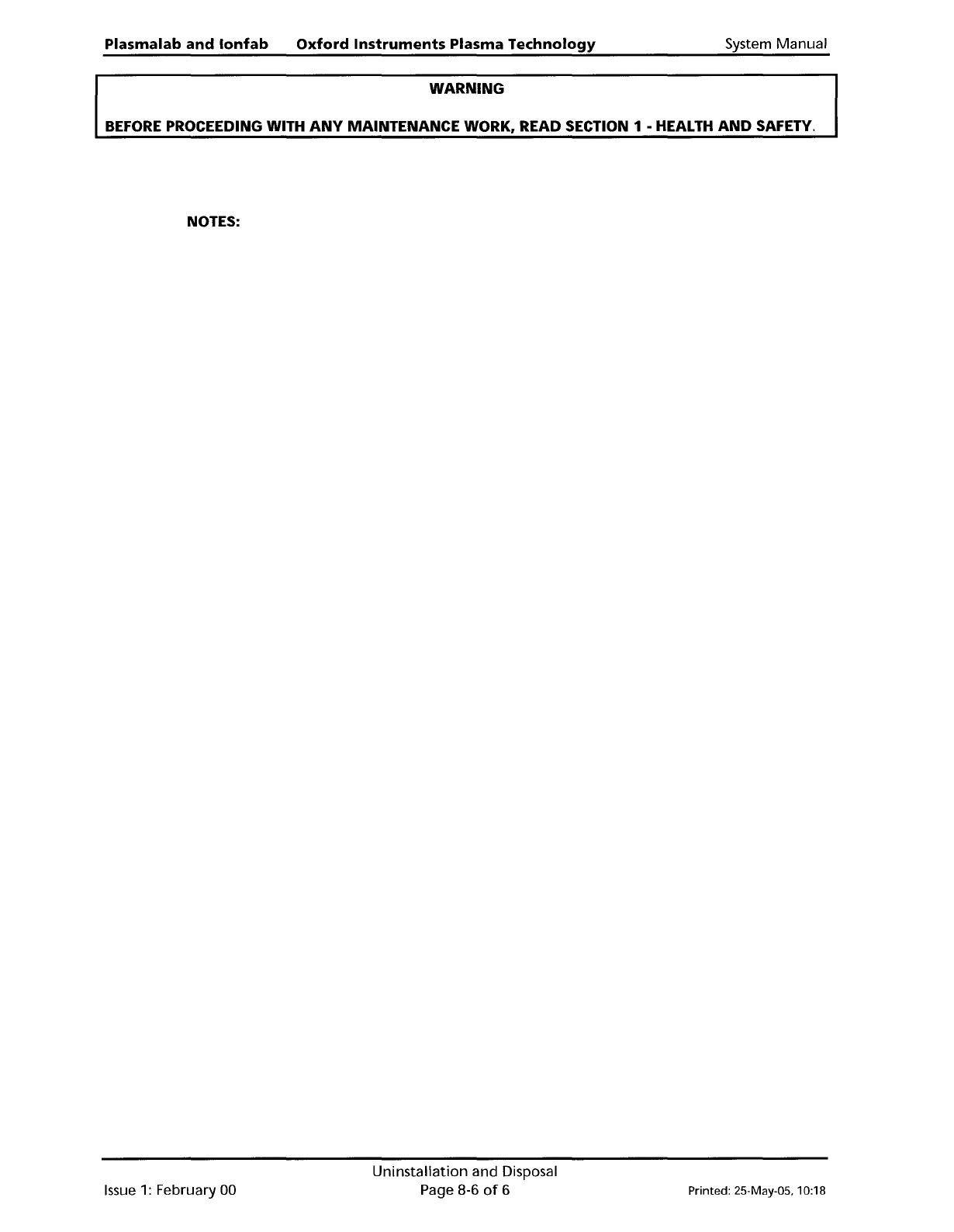 System Manual Oxford Instruments Plasma Technology WARNING Plasma lab and lonfab BEFORE PROCEEDING WITH ANY MAINTENANCE WORK, READ SECTION 1· HEALTH AND SAFETY. 4) Prepare the system frames for transport by disconnecting…