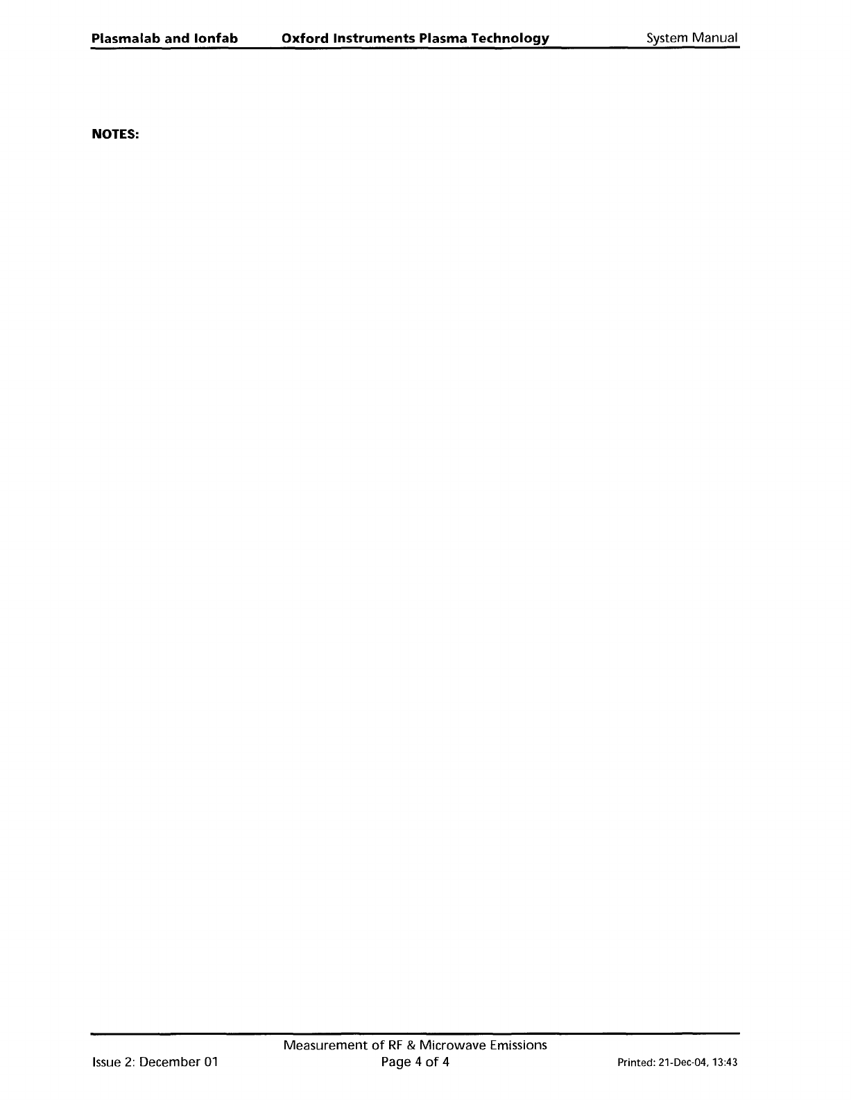 Plasma lab and lonfab NOTES: Issue 2: December 01 Oxford Instruments Plasma Technology Measurement of RF & Microwave Emissions Page 4 of 4 System Manual Printed: 21-Dec-04, 13:43