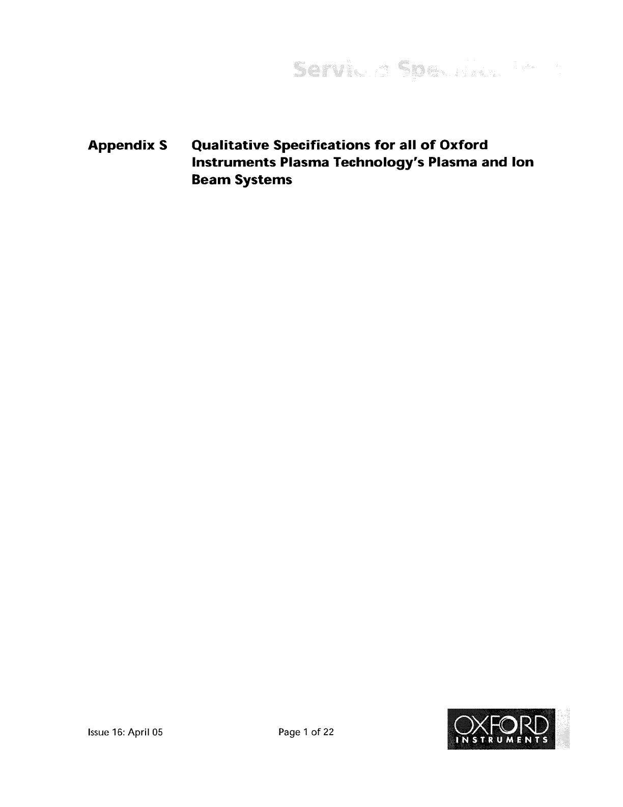 Appendix S Qualitative Specifications for all of Oxford Instruments Plasma Technology's Plasma and Ion Beam Systems Issue 16: Apri I 05 Page 1 of 22