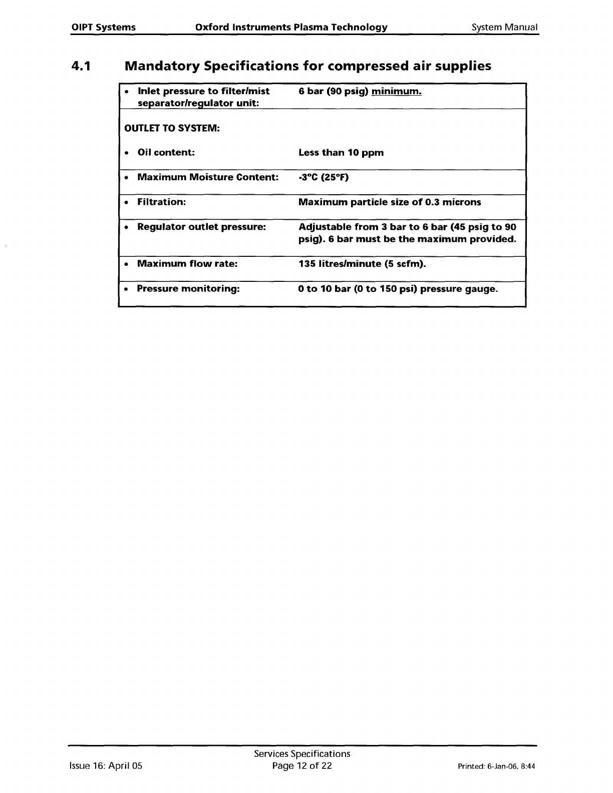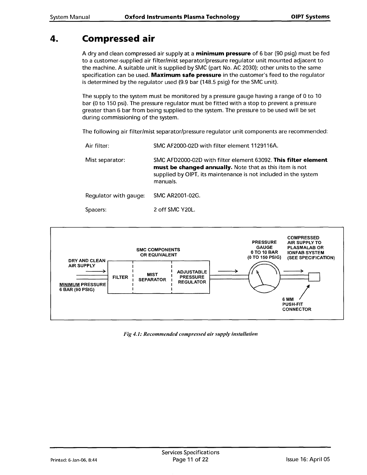 System Manual Oxford Instruments Plasma Technology OIPT Systems 4. Compressed air A dry and clean compressed air supply at a minimum pressure of 6 bar (90 psig) must be fed to a customer-supplied air filter/mist separato…