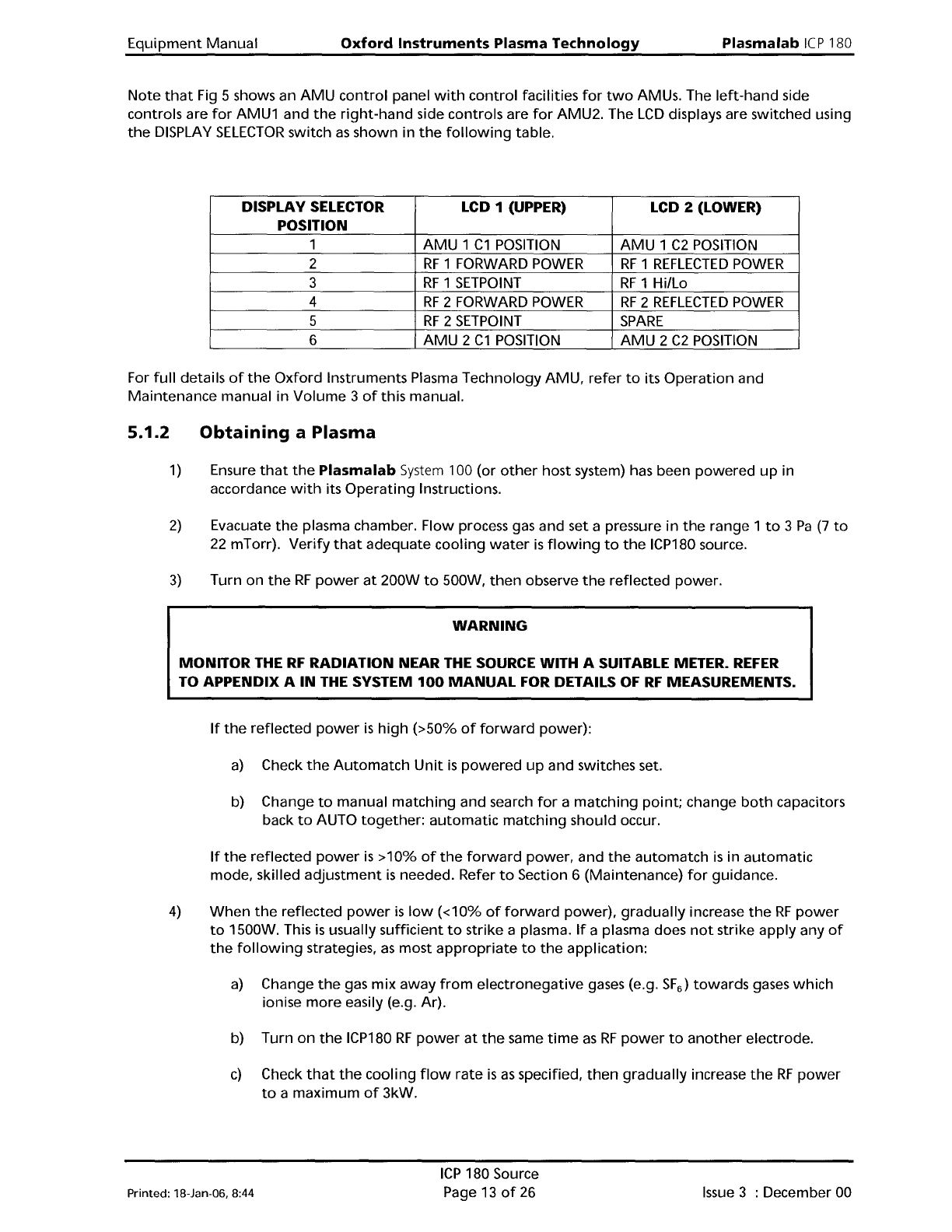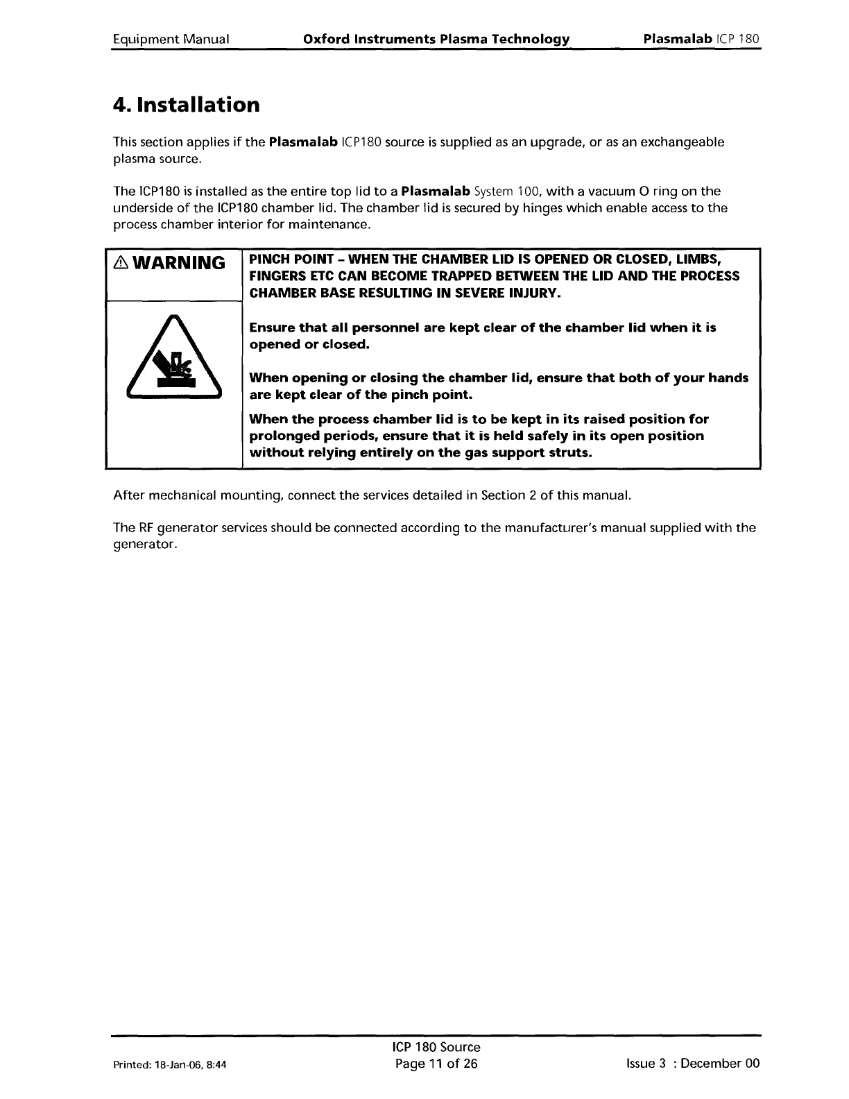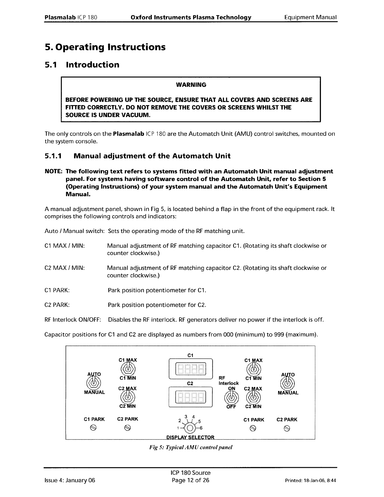 Plasma lab ICP 180 Oxford Instruments Plasma Technology Equipment Manual 5. Operating Instructions 5.1 Introduction WARNING BEFORE POWERING UP THE SOURCE, ENSURE THAT ALL COVERS AND SCREENS ARE FITTED CORRECTLY. DO NOT R…