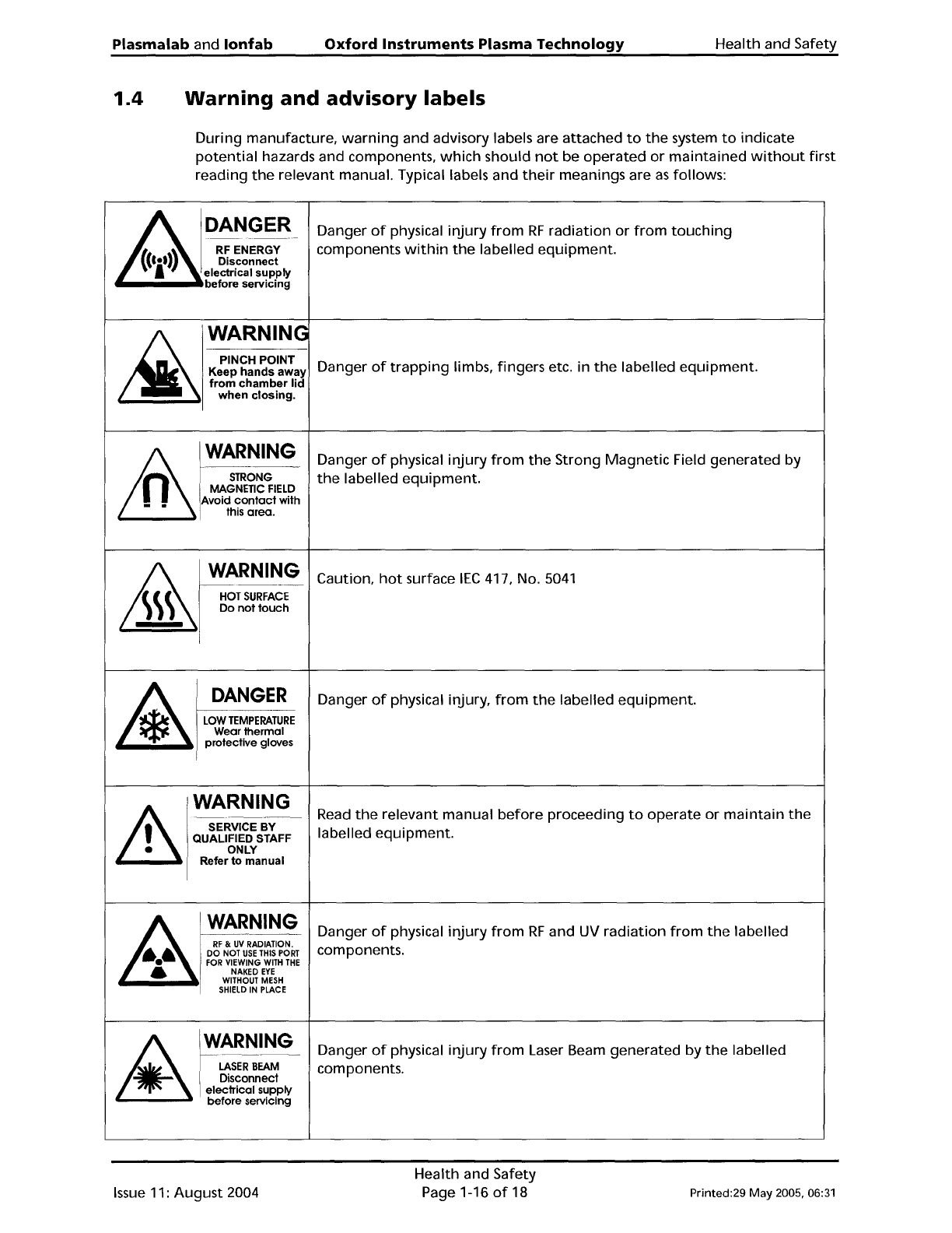 Health and Safety Oxford Instruments Plasma Technology Plasma lab and lonfab 1.3.12.9 Never smoke or eat in the 'clean room' or where gases are stored. In addition to the fire risks and particulate contaminatio…