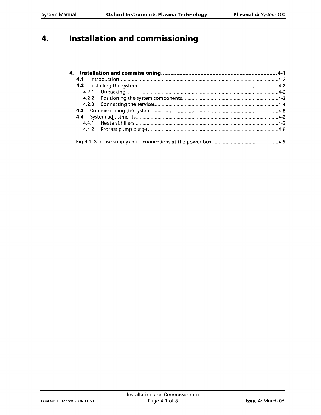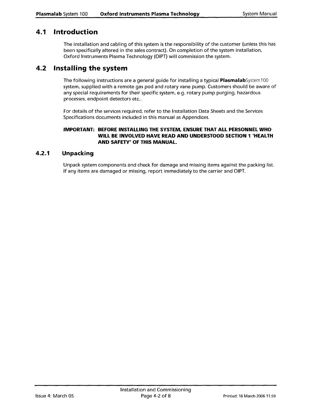 System Manual Oxford Instruments Plasma Technology Plasma lab System 100 4. Installation and commissioning 4. Installation and commissioning 4-1 4.1 Introduction .4-2 4.2 Installing the system 4-2 4.2.1 Unpacking 4-2 4.2…