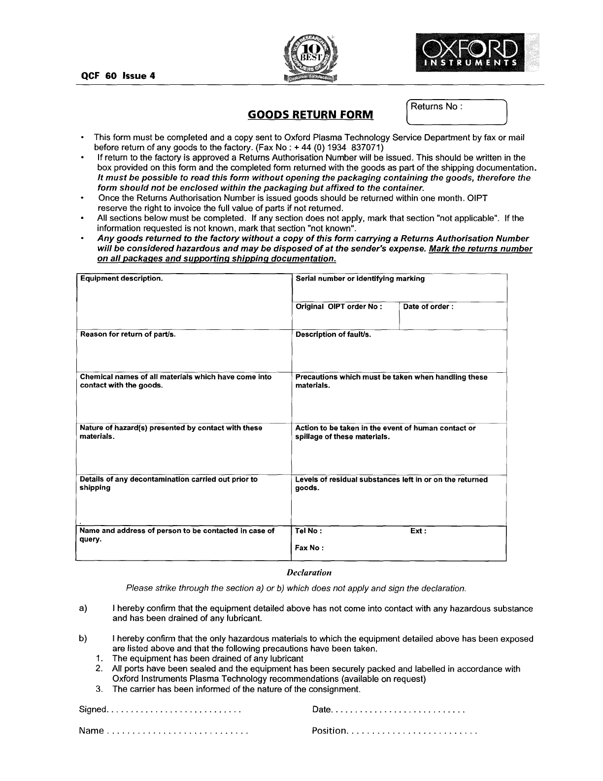 This form must be completed and a copy sent to Oxford Plasma Technology Service Department by fax or mail
