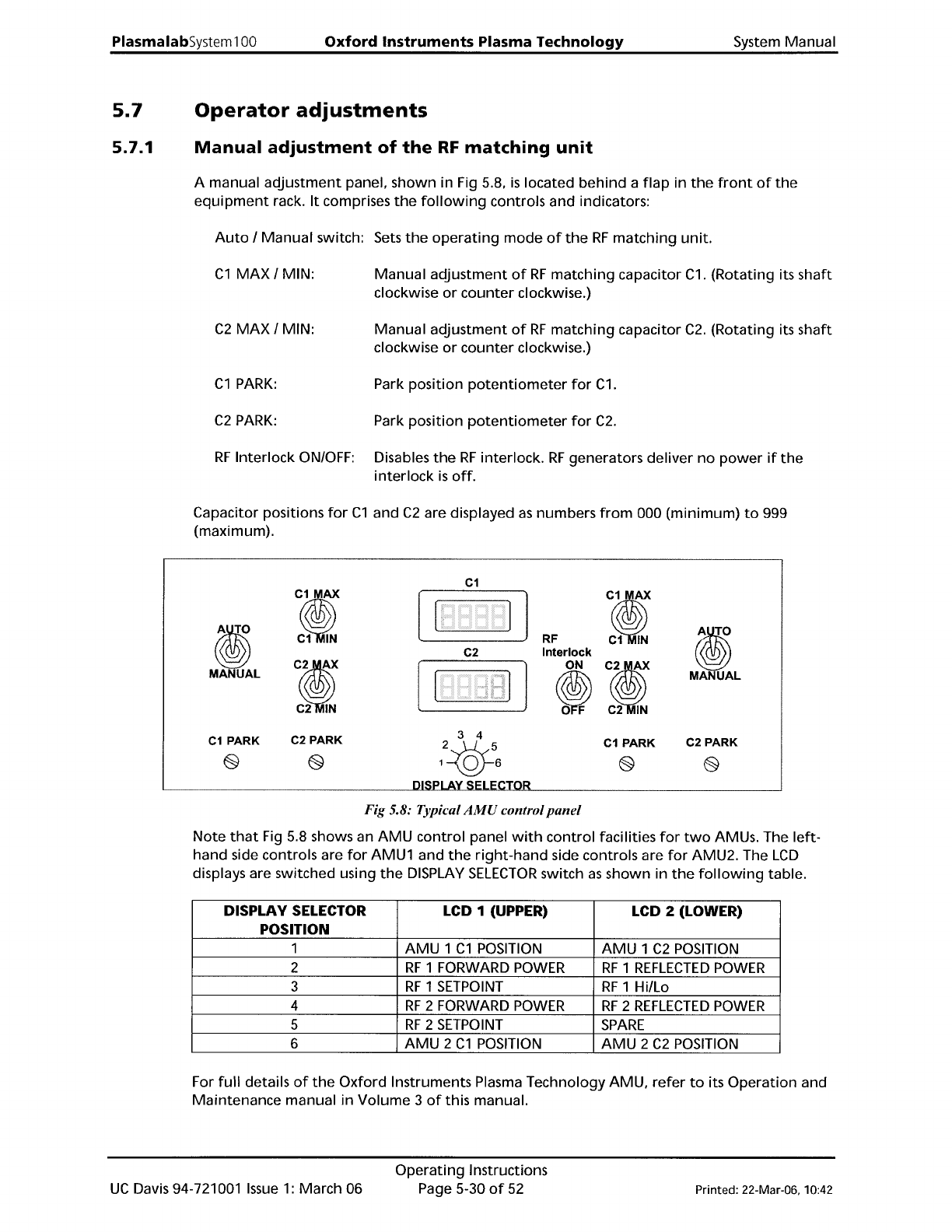 PiasmaiabSystem100 Oxford Instruments Plasma Technology System Manual 5.7 5.7.1 Operator adjustments Manual adjustment of the RF matching unit A manual adjustment panel, shown in Fig 5.8, is located behind a flap in the …