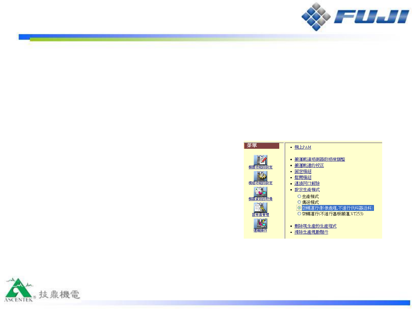 3.6.2 在附屬軟體中開啟 IDLE 模式 : 附屬軟體 -- module -- 遠端操作 -- 設定 生產模式 - 空轉模式 ( 影像處理 , 不進行供 料器送料 ) ( 注︰進行 IDLE 模式程式應選擇有吸嘴 切換動作的程式才能達到預期效果 )