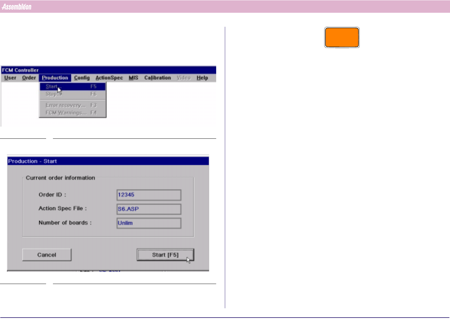 4022 591 960 62 Operating Manual 02.0 2 FCM Mu ltif lex 64 Start Production CHAPTER 9 Start Pr oduct ion If case of an error , se e Chapter 11: Error Handling 1. SCREEN 49 2. SCREEN 50 CAUTION WHEN USING BI, MAKE SURE TH…