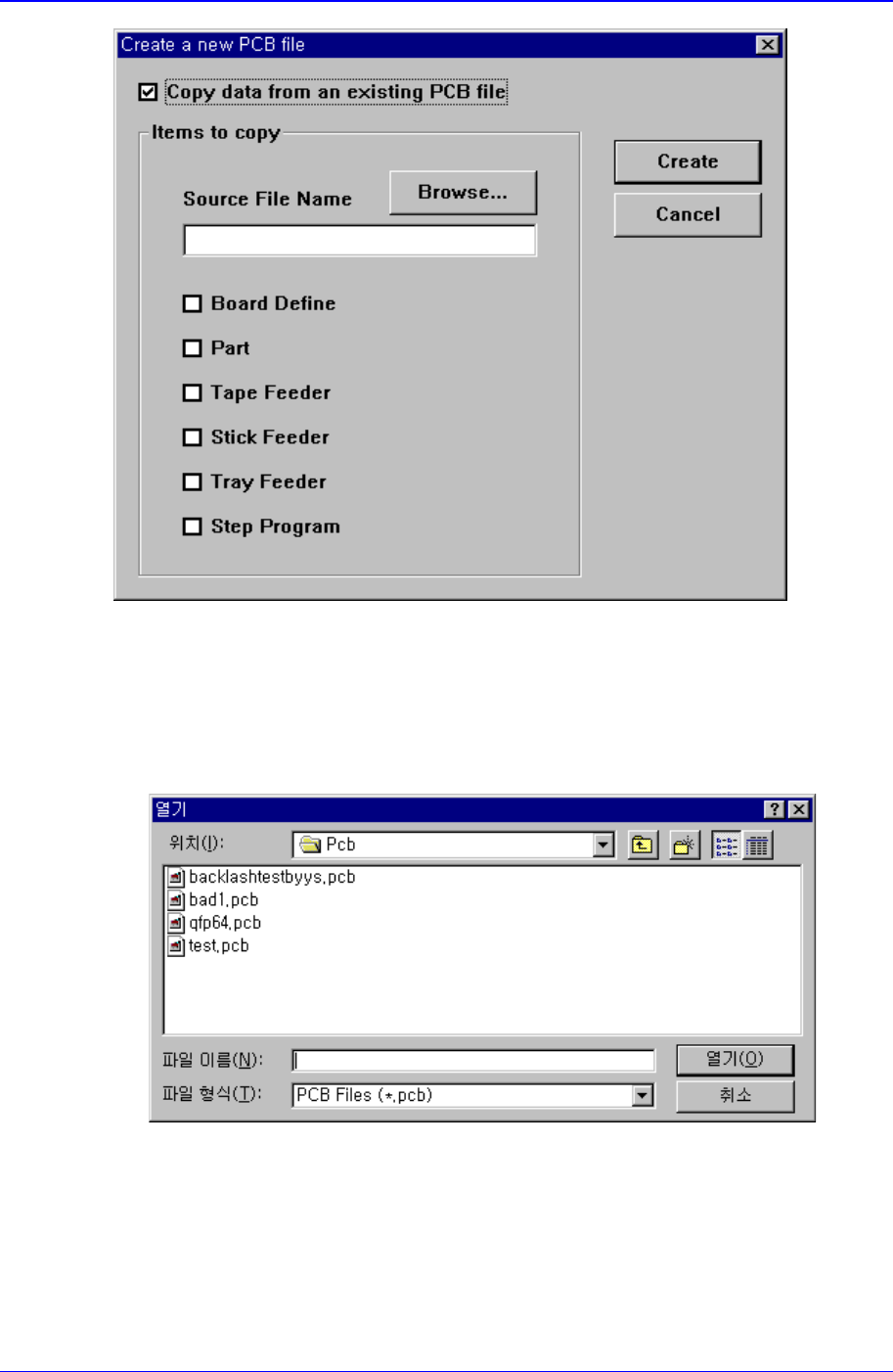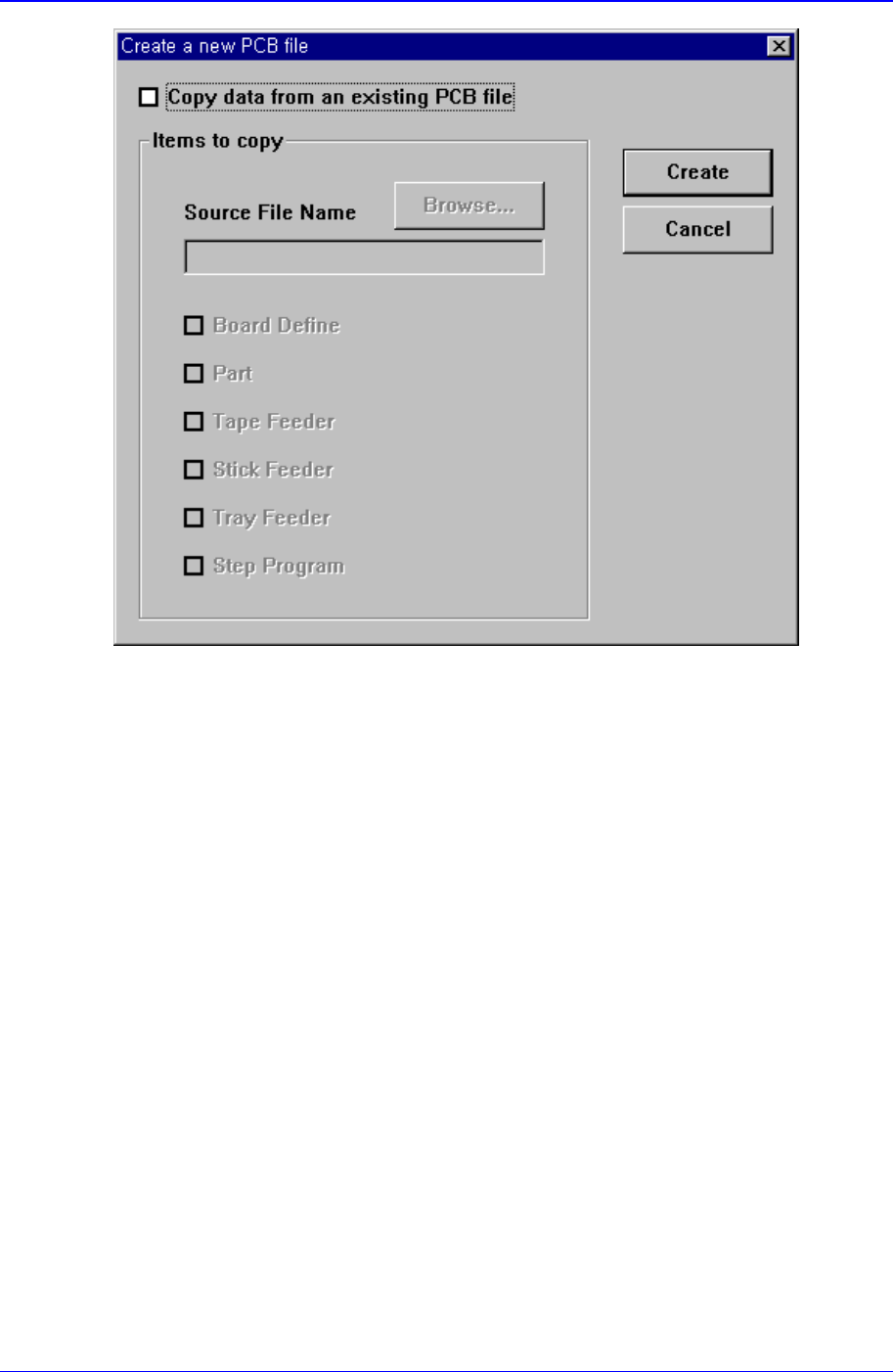 Samsung Component Placer CP-45F(V)/FS Operations Manual 8-2 Figur e 8-2. “ New PCB File ” dialog box <Copy data from an existing PCB file> check box Used to copy certain data from an existing file and create a ne…