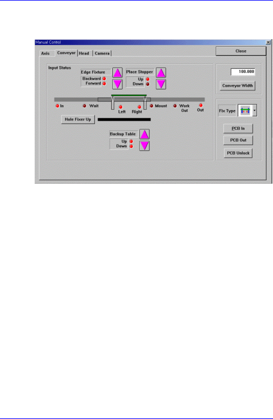V iew Commands 9-5 9.1.2. Conveyor Dialog Box Operates the conveyor and the devices attached to the conveyor . Figur e 9-3. “ Manual T ools – Conveyor ” dialog box <Edge Fixture> button Moves backward or forward …
