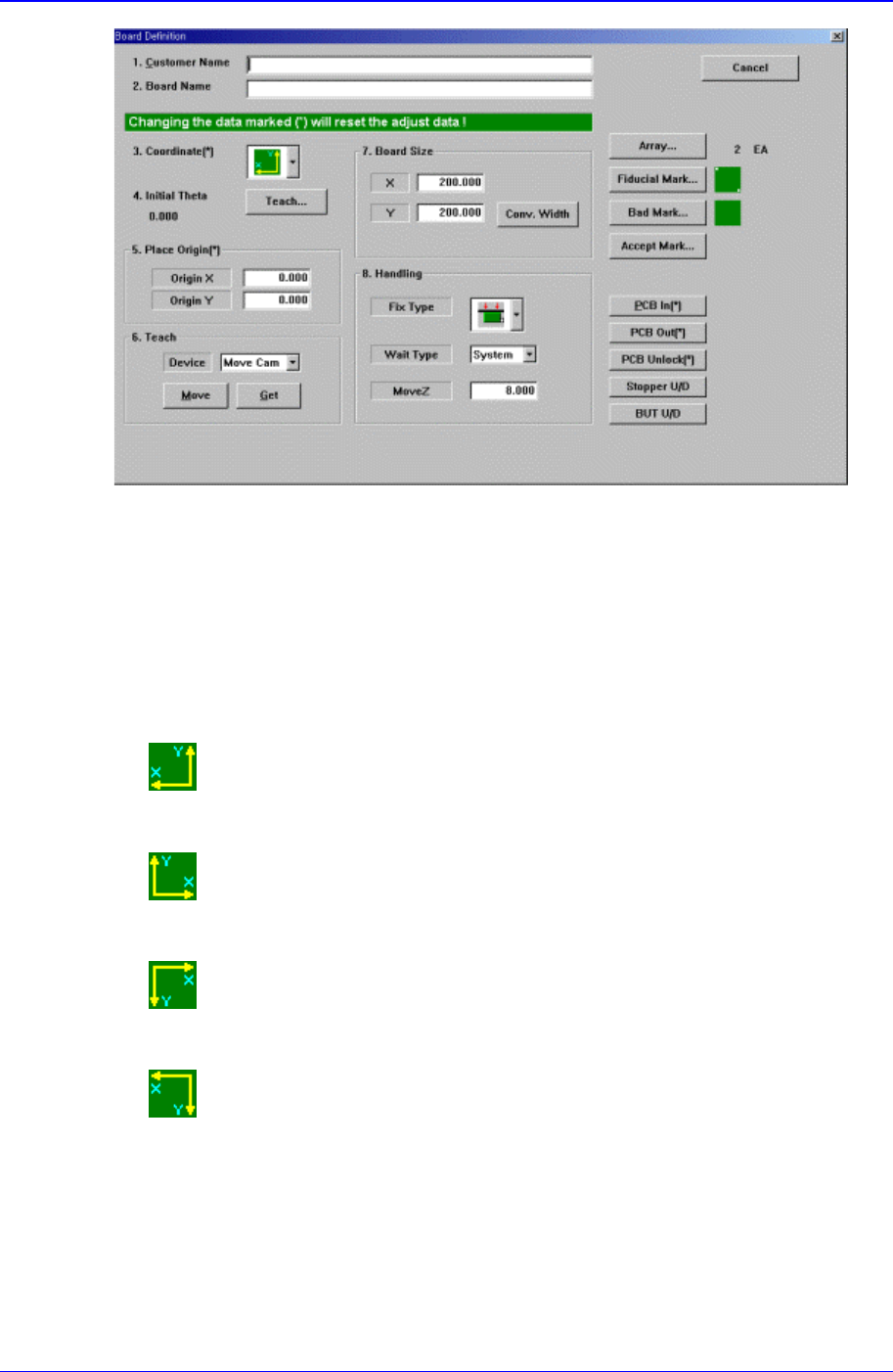 PCB Edit Command 11 - 3 It is activated when there is fiducial mark data. This button is used to teach the initial th eta of PCB. When this button is clicked on, the following screens are displayed in succession. When te…