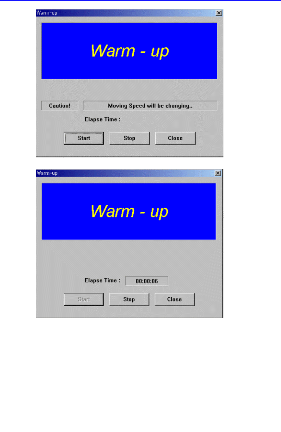 Samsung Component Placer CP-45F(V)/FS Operations Manual 13-6 Figur e 13-8. “ Wa r m - U p ” dialog box Figur e 13-9. “ Wa r m - U p ” dialog box, After pr essing the Start Button <Start> button Starts the warm up…