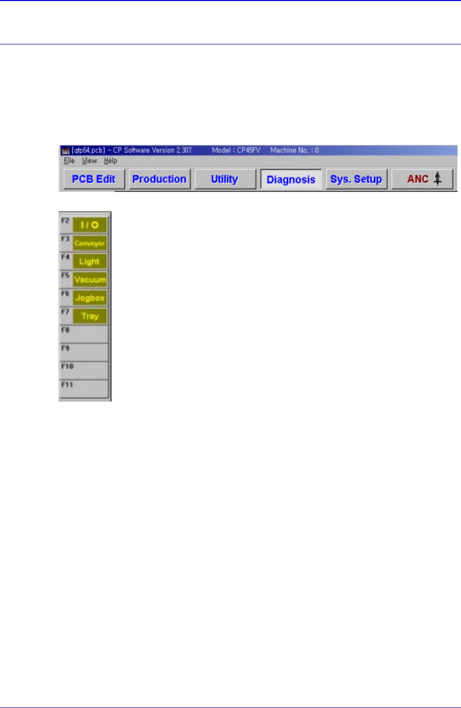 Diagnosis Command 14-1 Chapter 14. Diagnosis Command The Diagnosis command is composed of 6 submenus: I/O , Conveyor , Light, V acuum, Jogbox, and T ray . This commands perform s a module test on each part. When a submen…