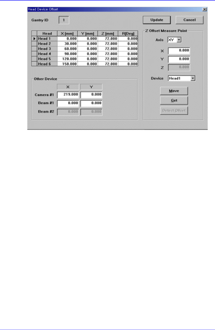 Samsung Component Placer CP-45F(V)/FS Operations Manual 15-6 Figur e 15-5. “ Sys. Setup : Head Device Of fset ” dialog box <Gantry ID Select> Static box Displays the ID of the gantry to which the head block is at…