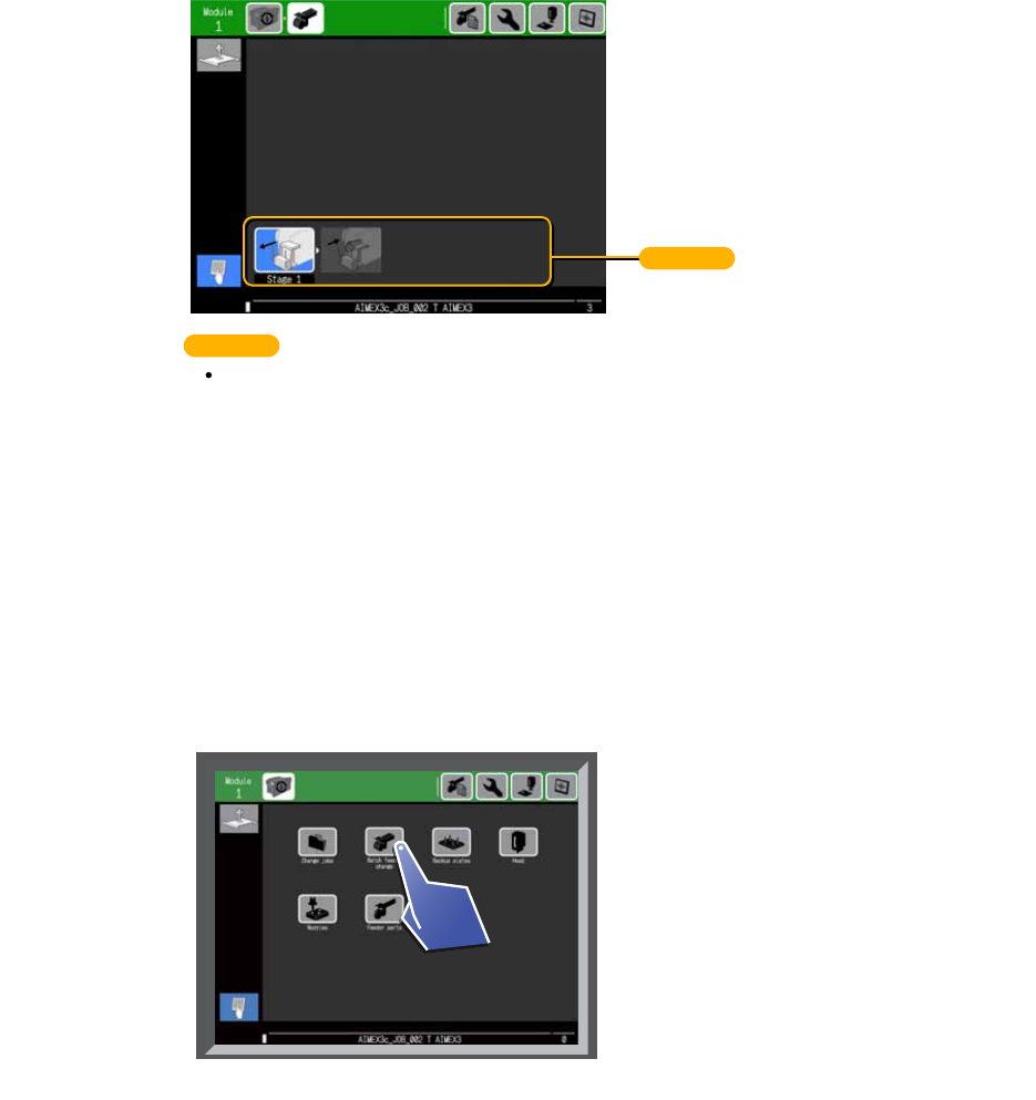 4. 生产准备 SYS-AIMEX3C-007S0 88 AIMEX III/AIMEX IIIc 系统手册 4.6 供料器的成批更换 移动式料站的机器时,能够批量更换 供料器。 请以 MFU-65(II) 为单位更换供料器。将用于下一次生产的供 料器搭载到备用 MFU-65(II) 上,然后替换下 当前使用的 MFU-65(II)。通过上述手段缩短换线时间。 4.6.1 供料器成批更换的向导画面 4.6.2 供料器成批更换的方法 供料…