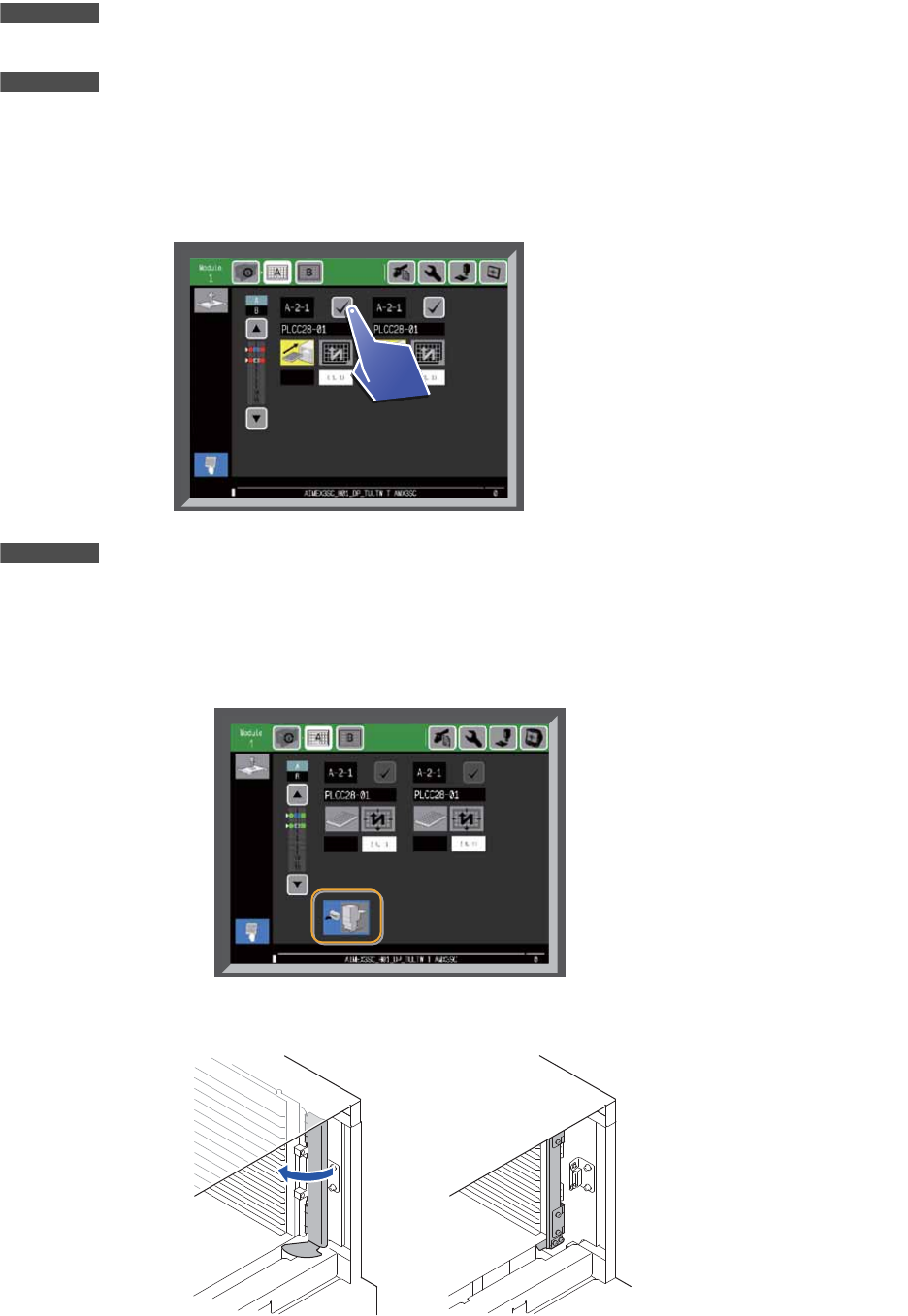 4. 生产准备 SYS-AIMEX3C-007S0 100 AIMEX III/AIMEX IIIc 系统手册 扫描元件。 不运用 Verify 功能时 ,不需要该操作。 1. 请使用 KIT Manager 或 KIT Handy 进行料盘验证 。 a. 请在 KIT Handy 或 KIT Manager 的画面上选择要补料的料槽。 b. 请利用 KIT Handy 或手持式扫描器扫描元件的条形码或 DID。运用定位检测式料盘验证时…