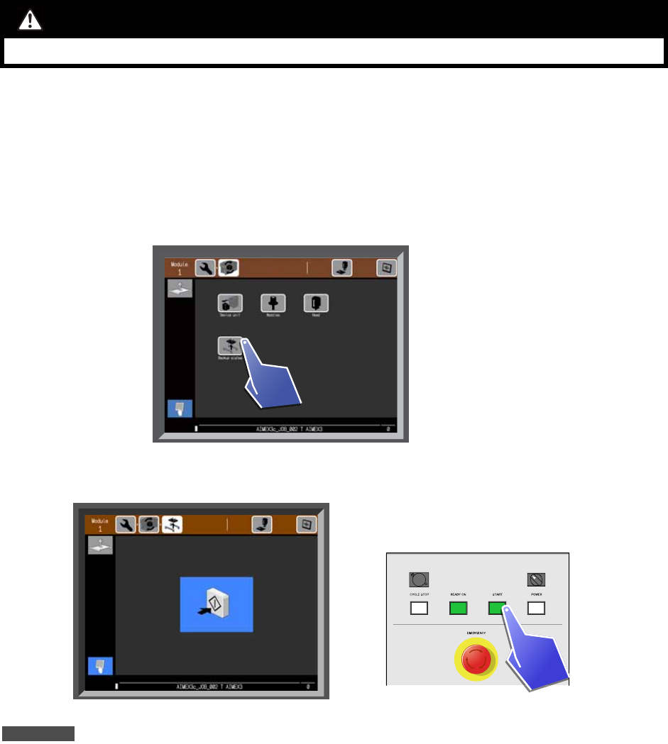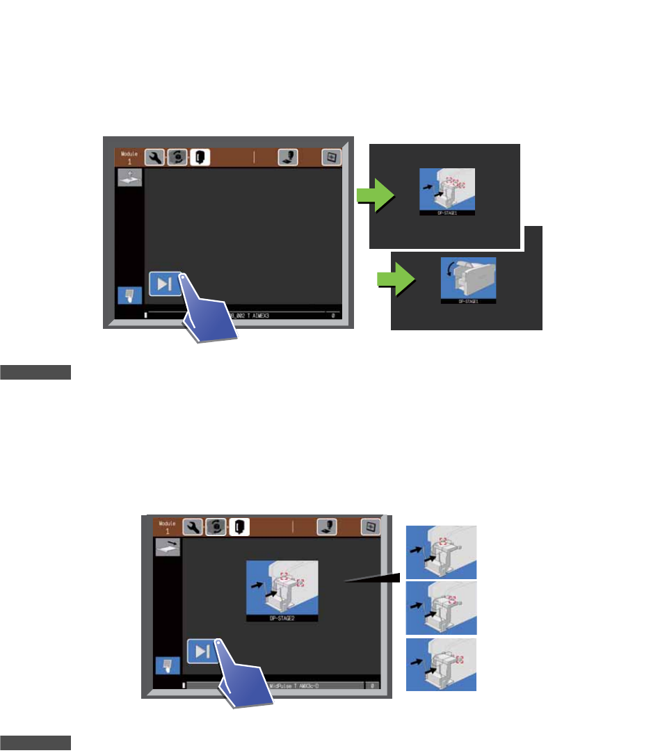 10. 操作画面上显示以下示意图时,请点击 [ 实行 ] 按键。机器将自动夹紧供料单元。