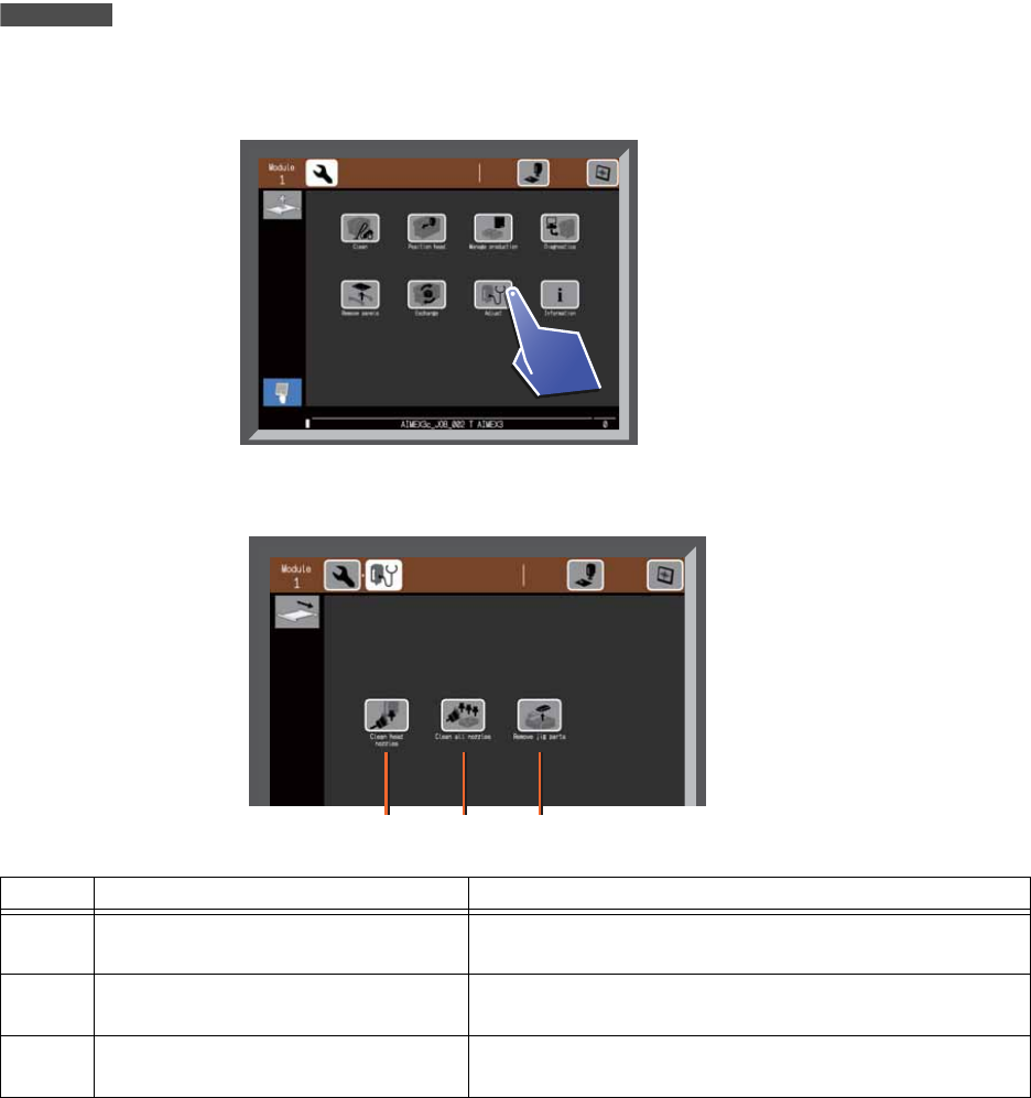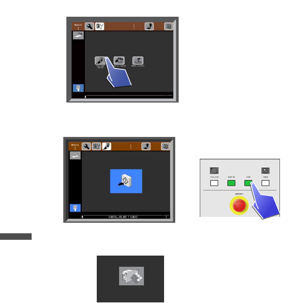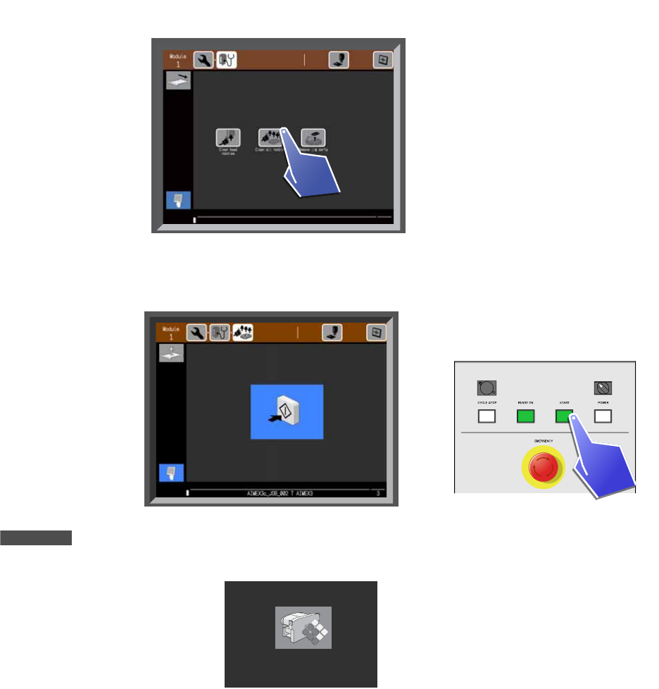 6. 手动模式指令的操作 SYS-AIMEX3C-007S0 210 AIMEX III/AIMEX IIIc 系统手册 6.8.1 清扫工作头的吸嘴 1. 请选择 [Clean head nozzle s] 指令。 2. 显示出吸嘴清扫的 开始等待画面。请将 带刷子的供料器搭载到任意一个料槽上 ,然后点击 [START] 按 键。 备注 在实行指令期间,显示机器正在运转的示意图。完成指令后,返回到 [Adjust] 指令的菜单画面。 …